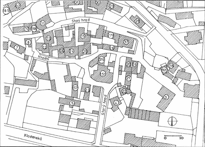 Současná situace zástavby v hradním areálu s uvedenými popisnými čísly domů podle katastrální mapy