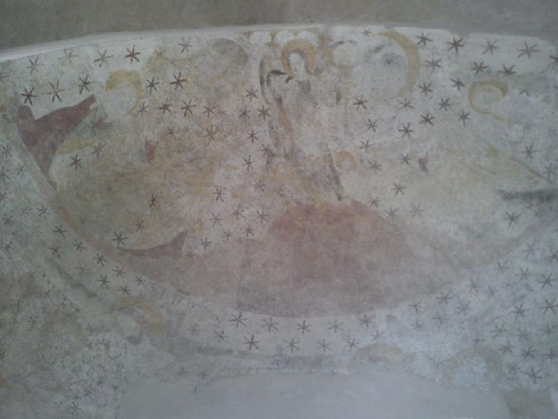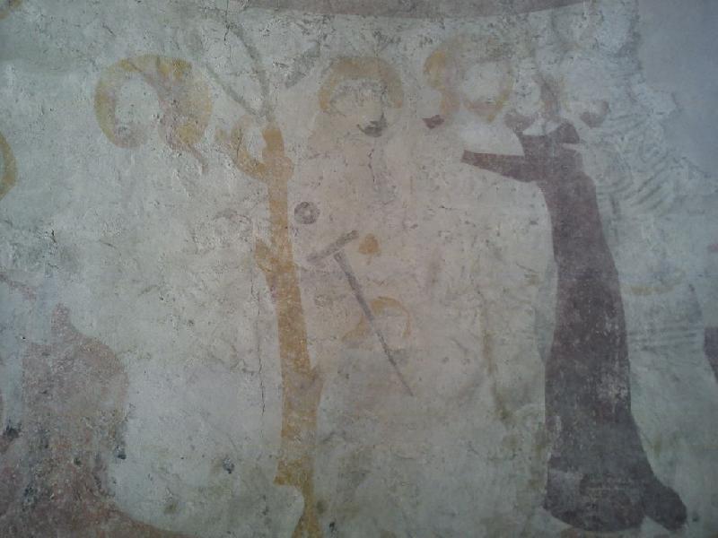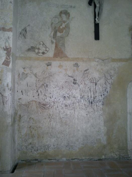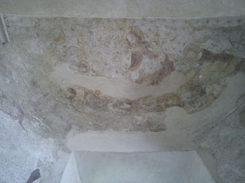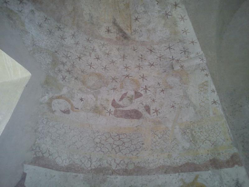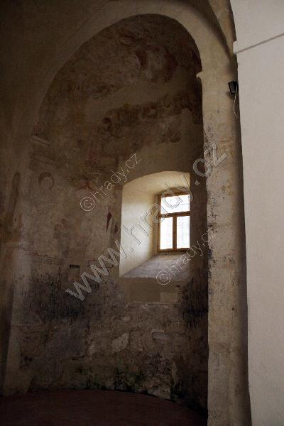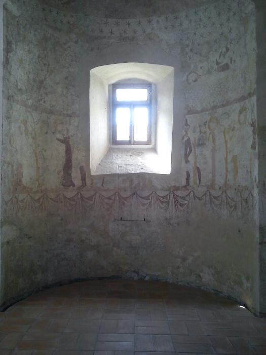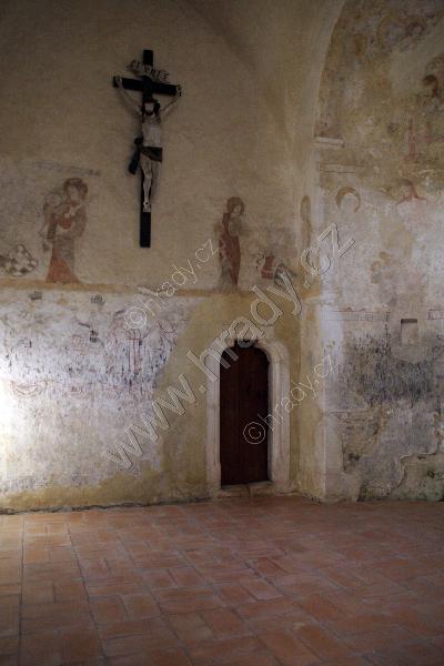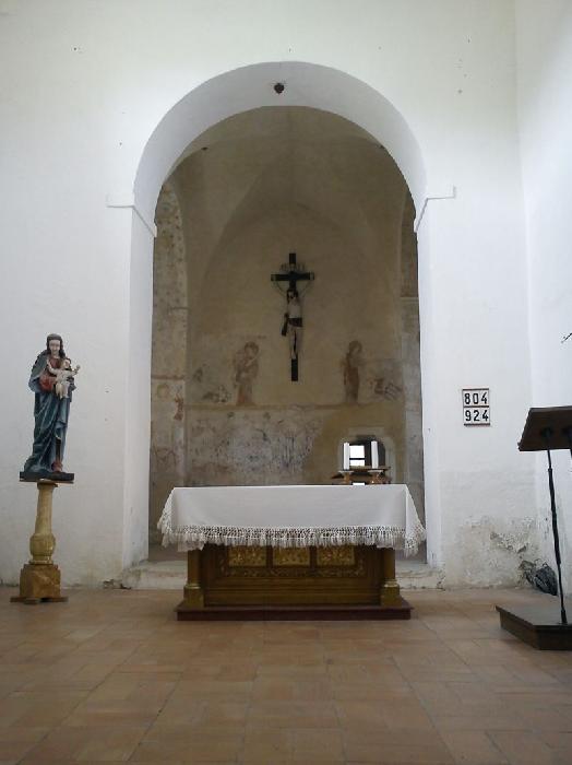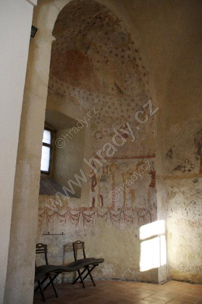 Pohled do presbytáře s freskami snad z 1. poloviny 14. století, objeveny náhodou roku 1959