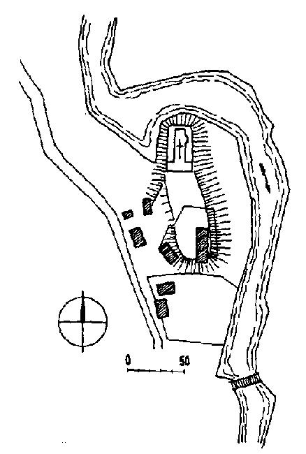 Pohled od chrámu, na levé vyvýšené straně stálo opevněné sídlo