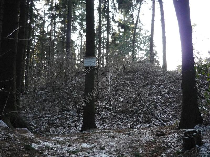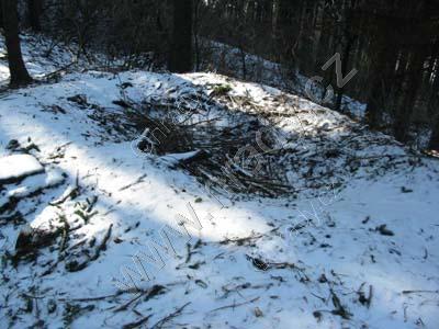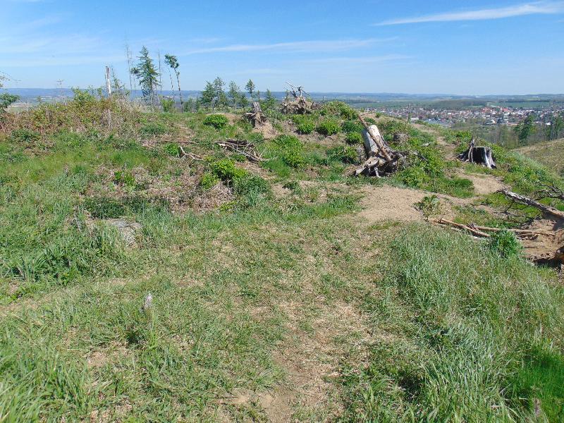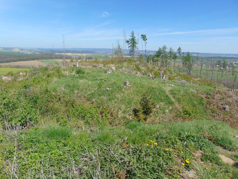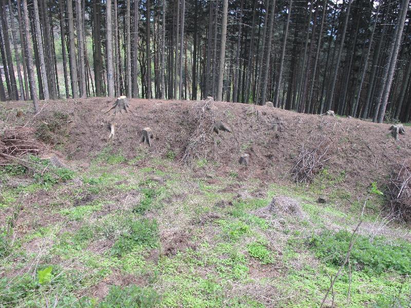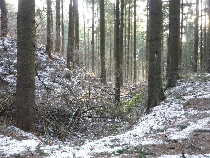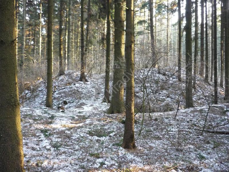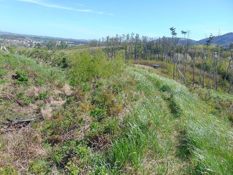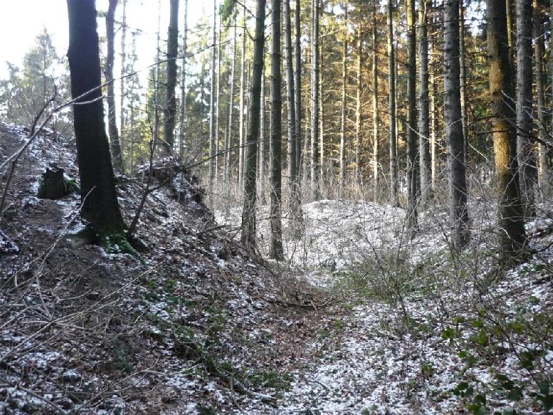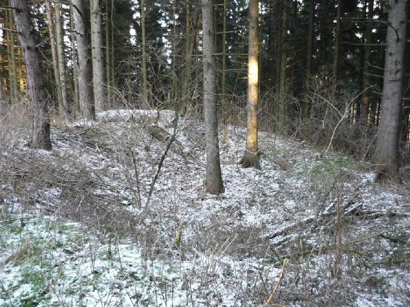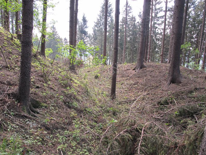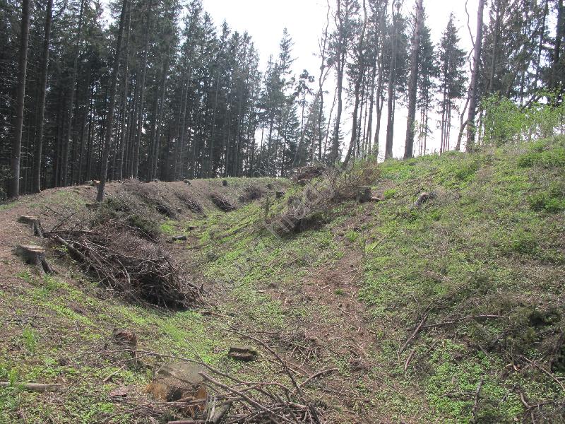 Těžbou zdevastovaný příkop obíhající vojenské táíbořiště