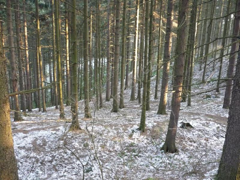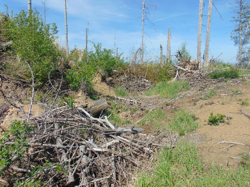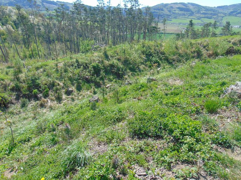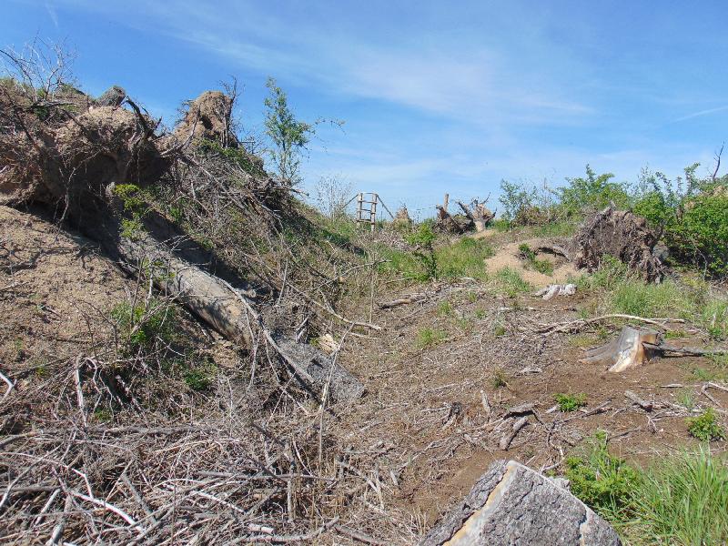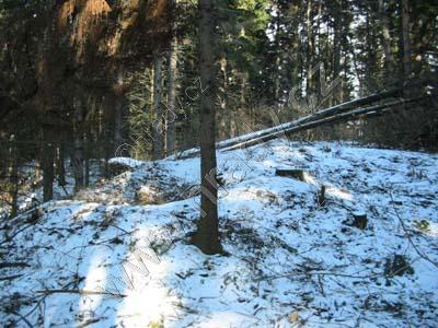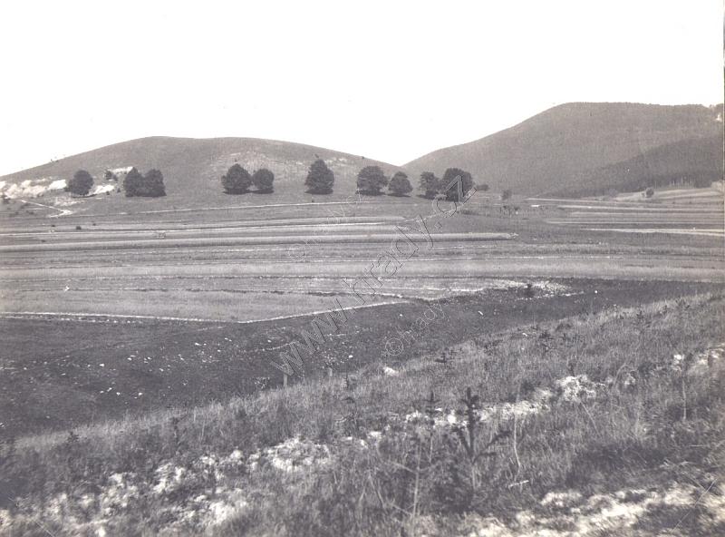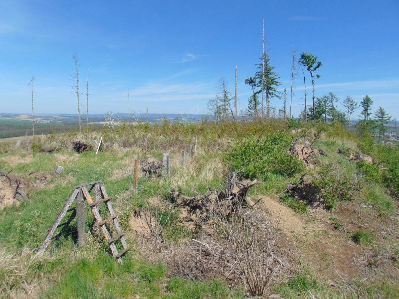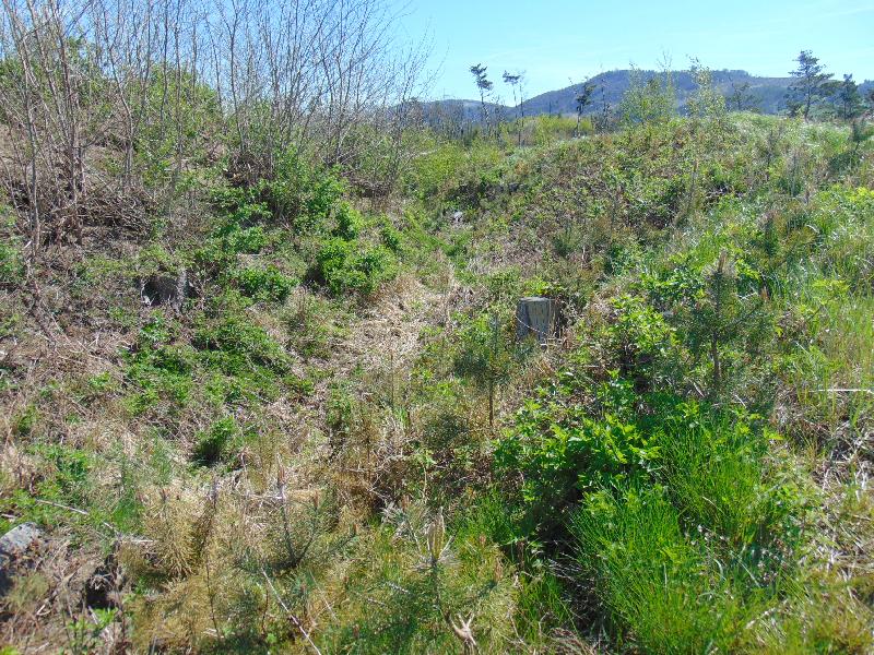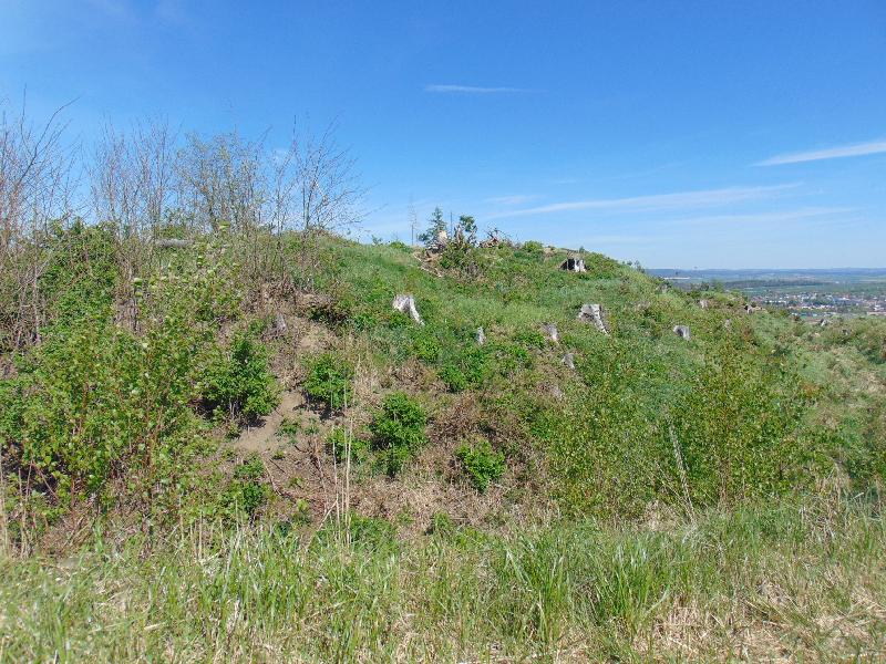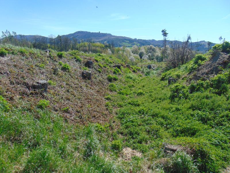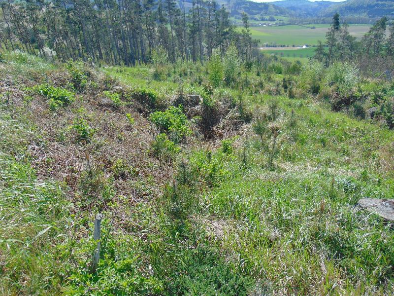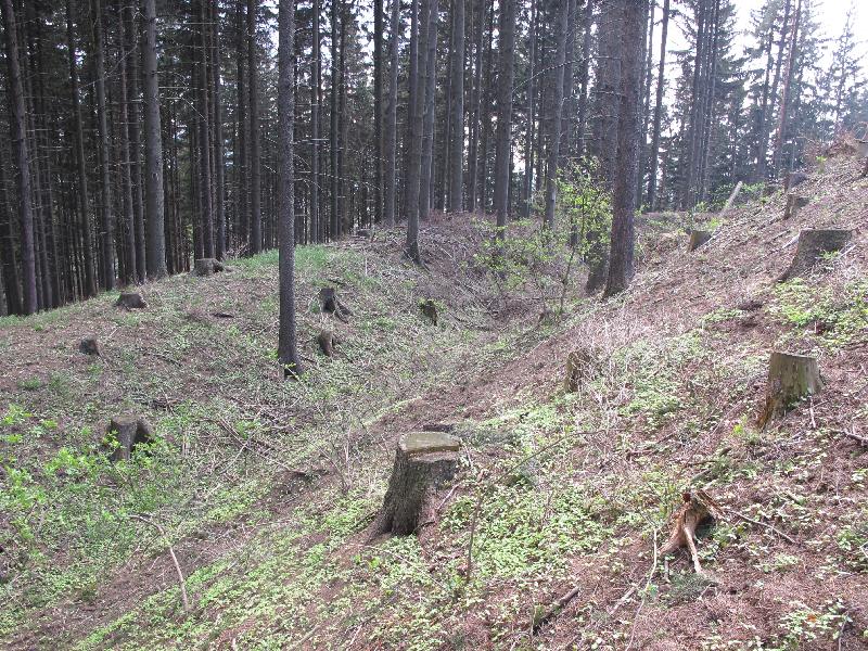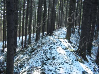 Těžbou zdevastovaný příkop obíhající vojenské táíbořiště