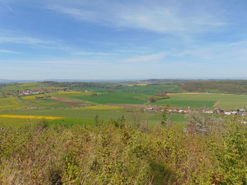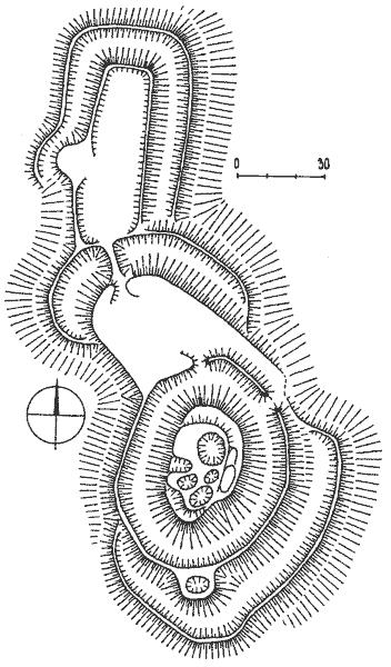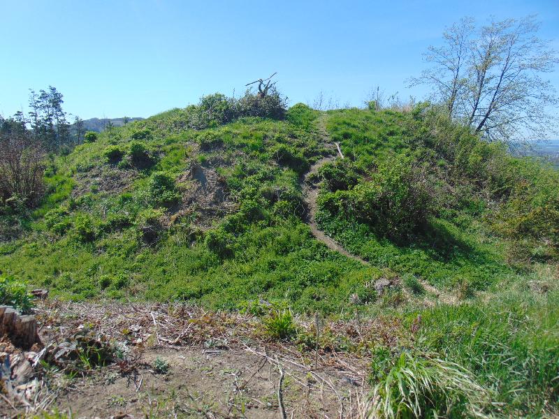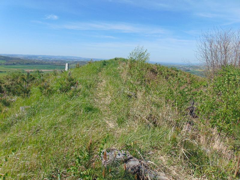 Jižní val od východu. Vlevo první (vnější) příkop, vpravo druhý (vnitřní) příkop.