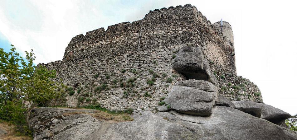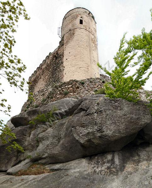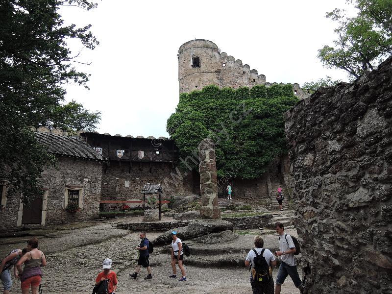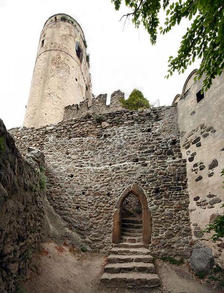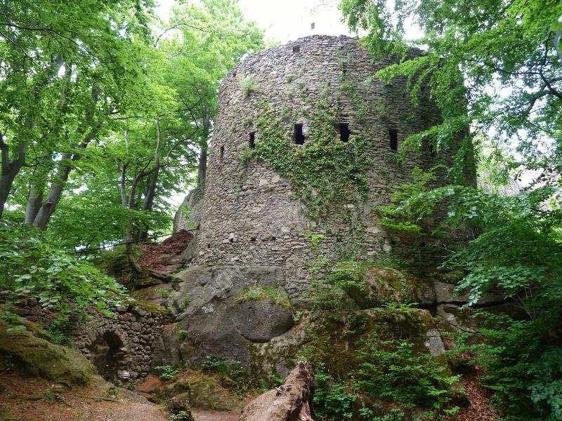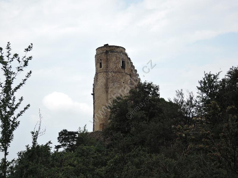 Pohled na hradní bergfrit od jihovýchodu, ze sousedních skal.