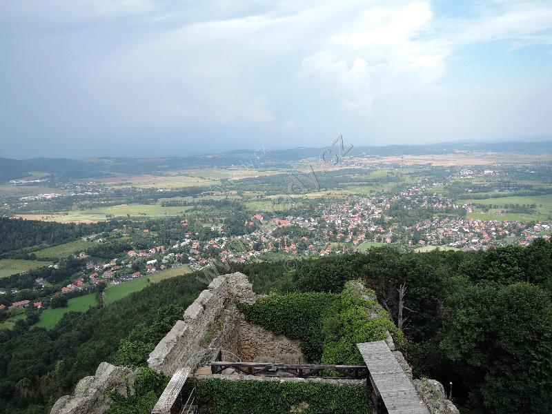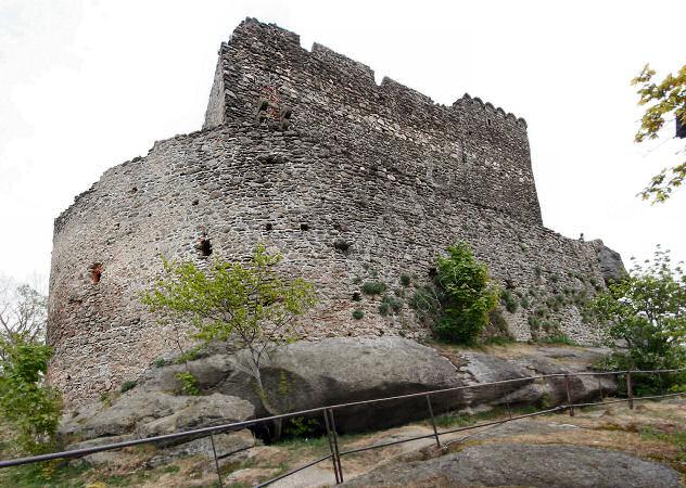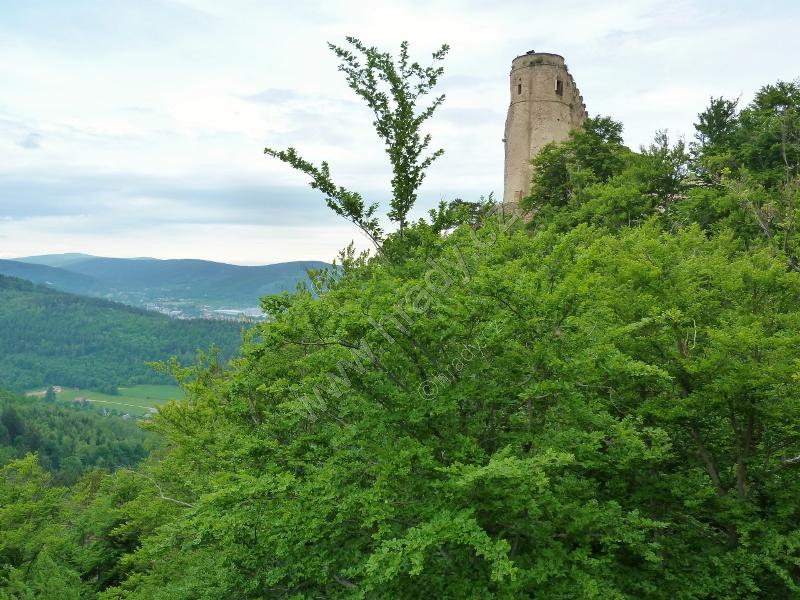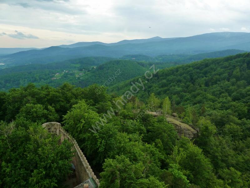 Hrad Chojnik - pohled na bergfrit z nedaleké vyhlídky