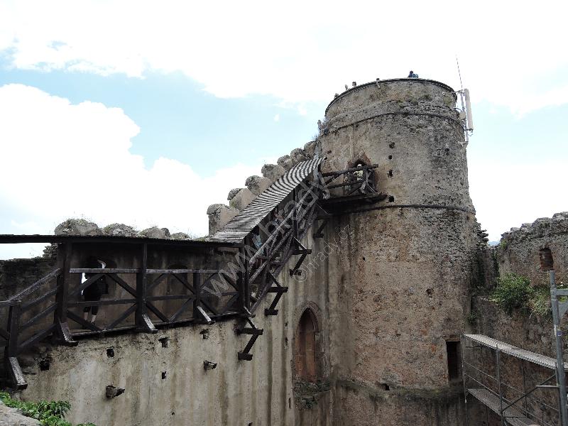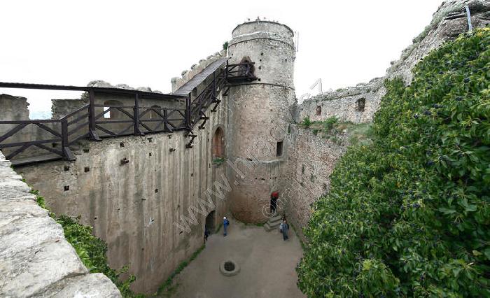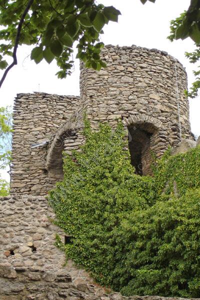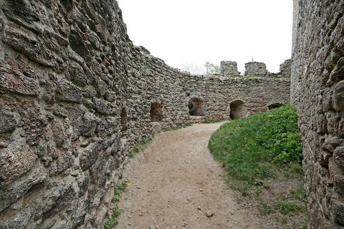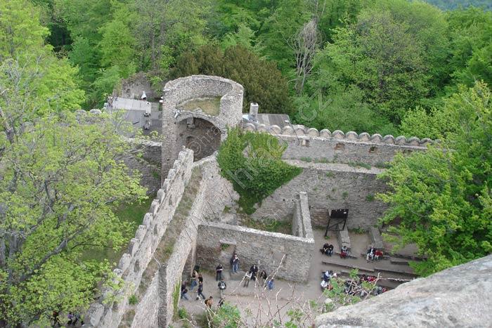 Pohled z bergfritu na opevnění vnitřního předhradí s kruhovou věží v nároží