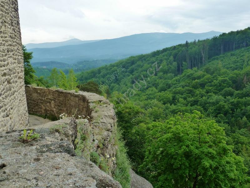 Pohled z hradu na Sněžku (nalevo) a na Malý Šišák (napravo).