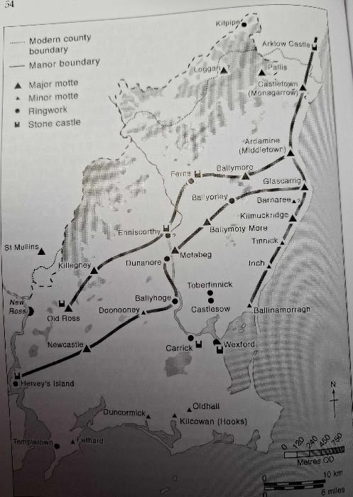 Rozmístění hradů v hrabství Wexford. Glascarrig je součástí pobřežní sítě hradů, navíc jím začíná druhá obranná linie, která chránila anglickou kolonii v JV cípu Irska. Hrabství samotné existuje teprve od 16. století.