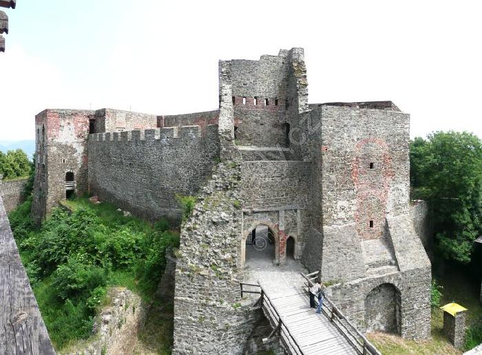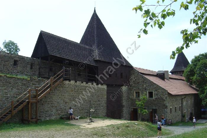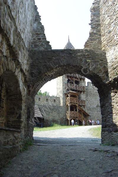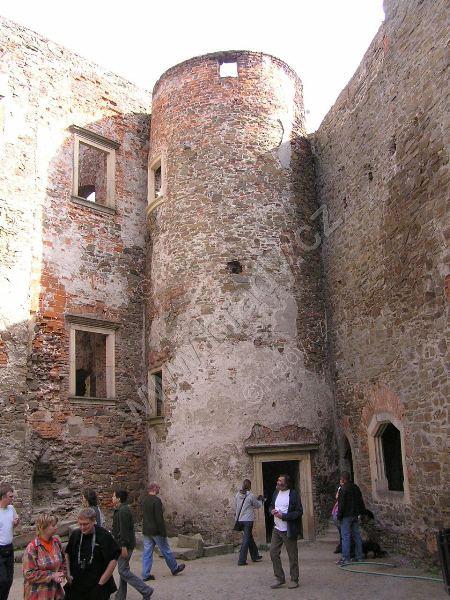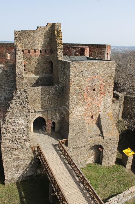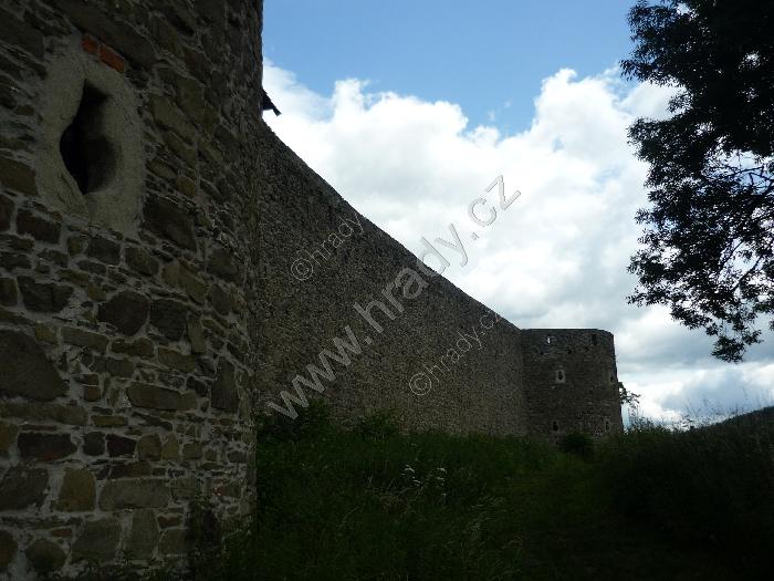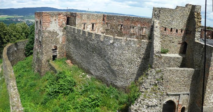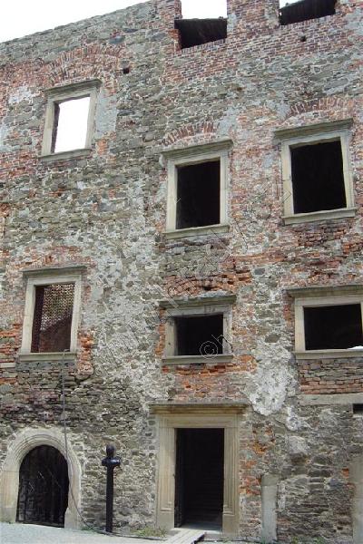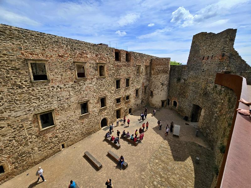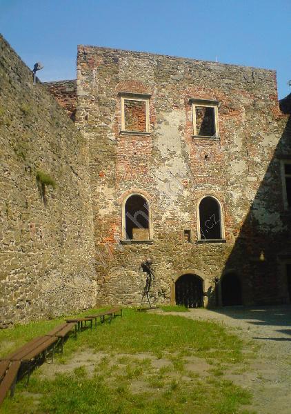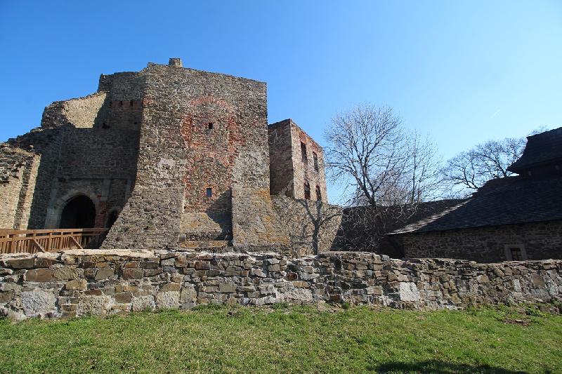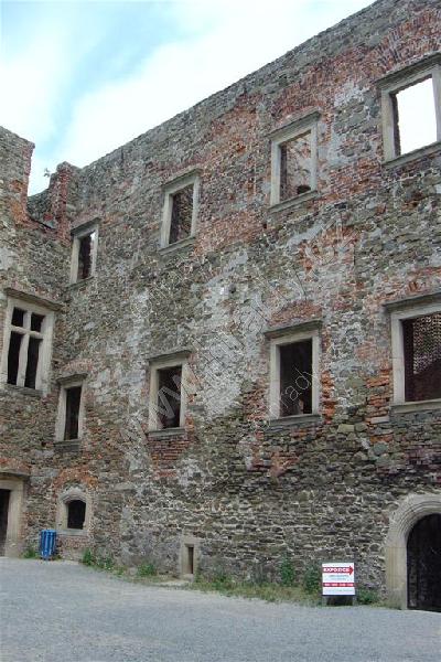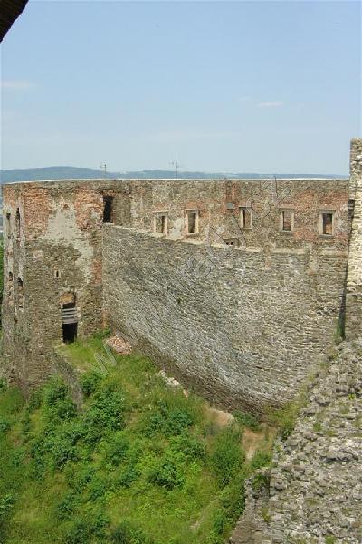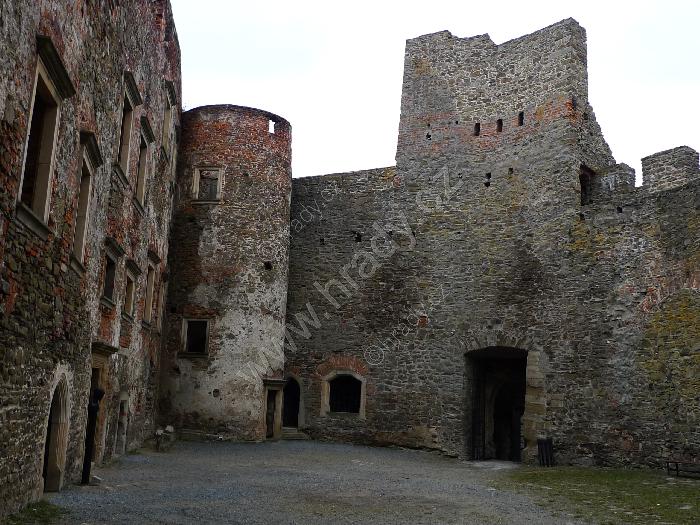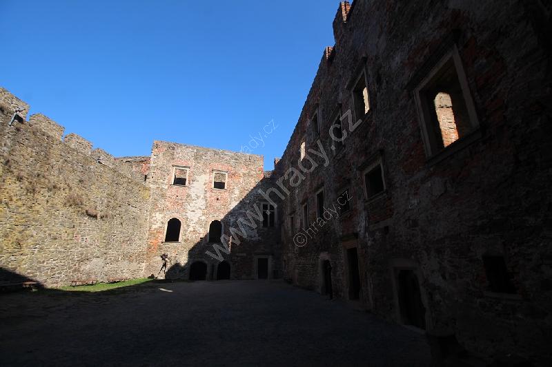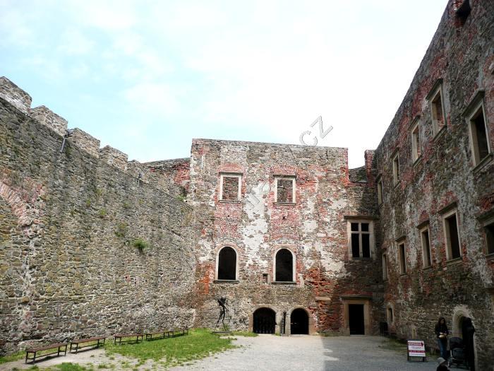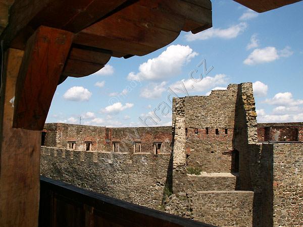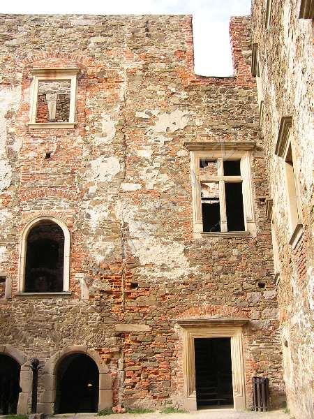 Pohled na nádvorní, jižní, fasádu severního paláce jádra hradu z 5. nádvoříá nejstarší gotickou fázi paláce z dob založení hradu.