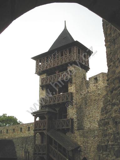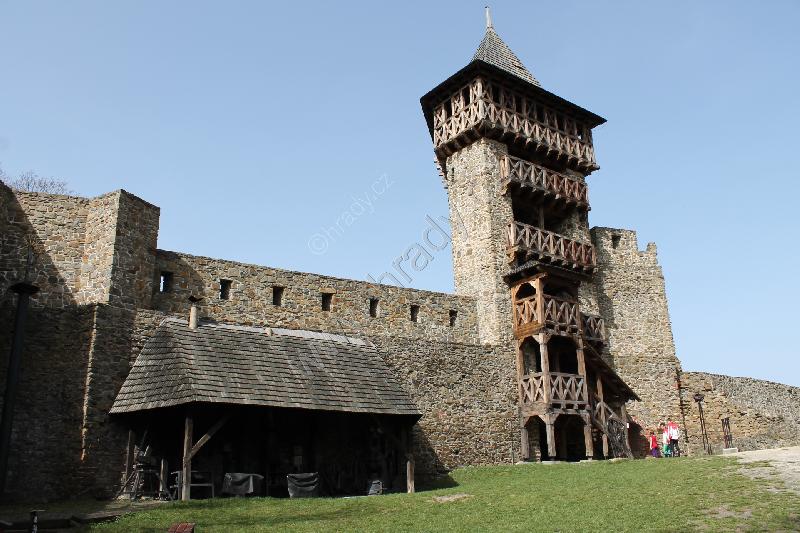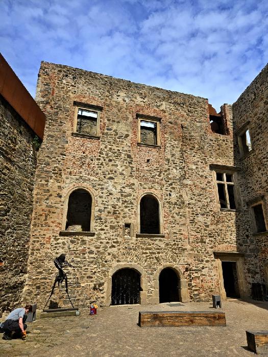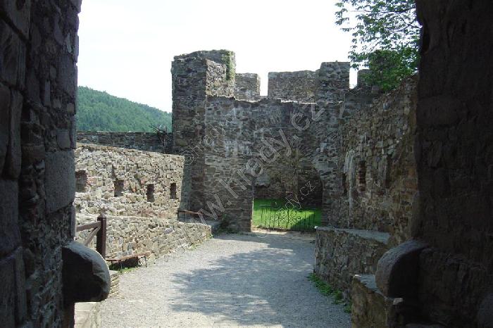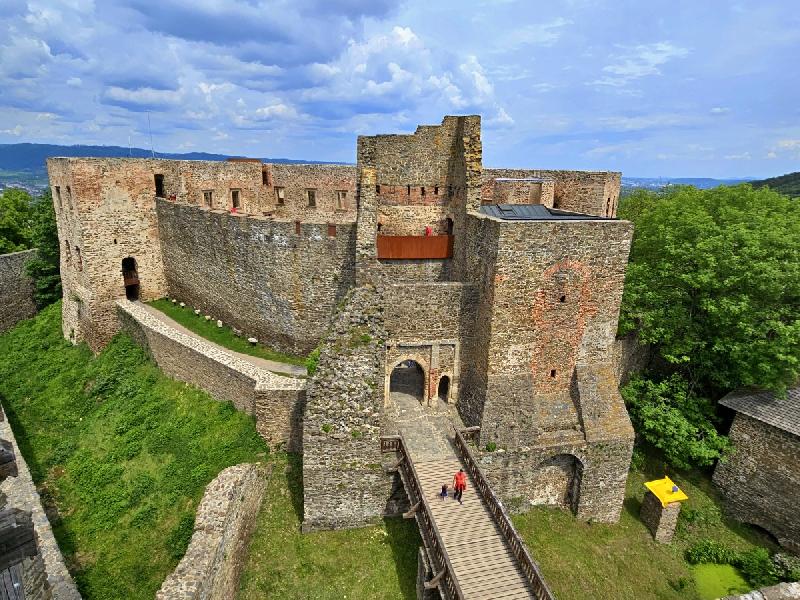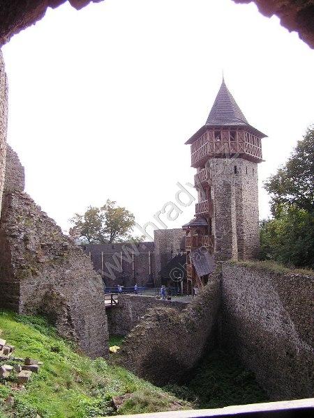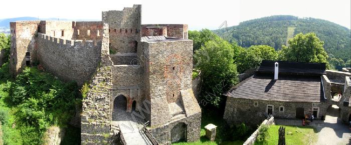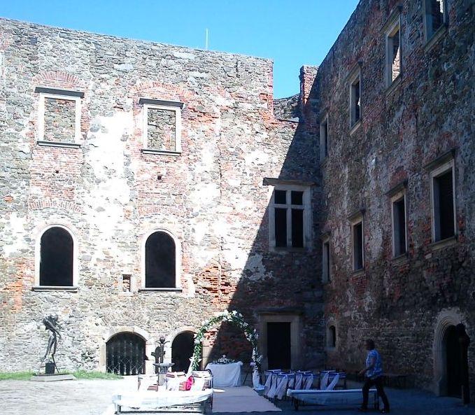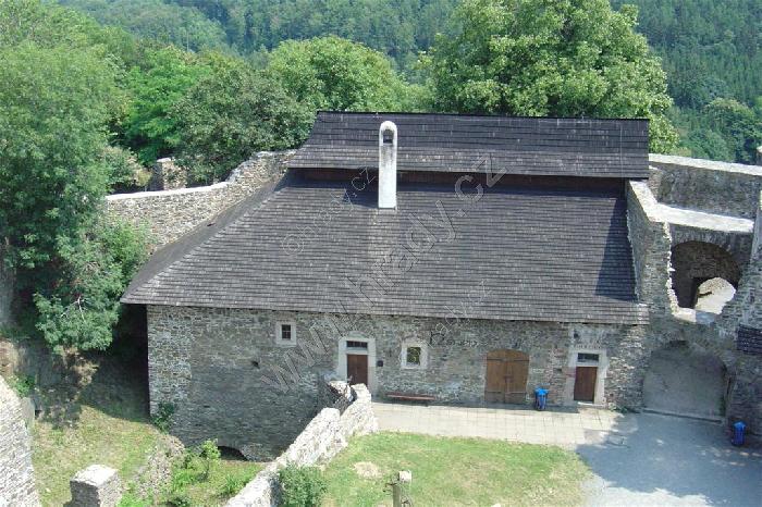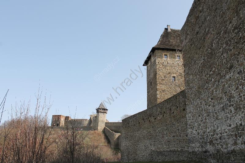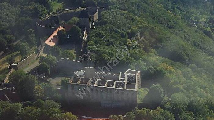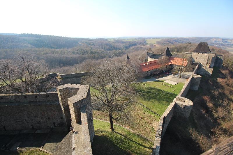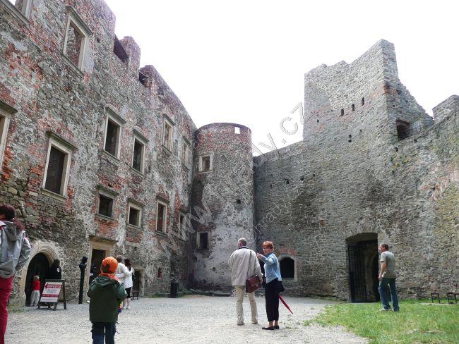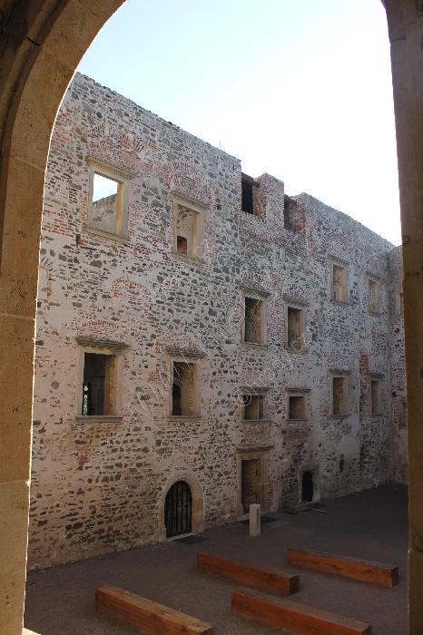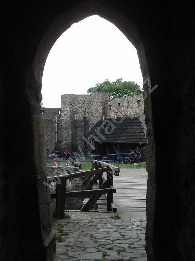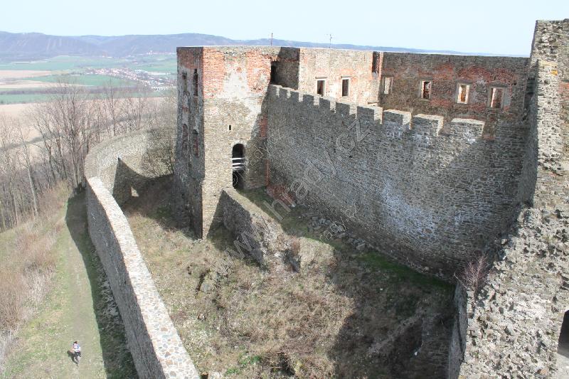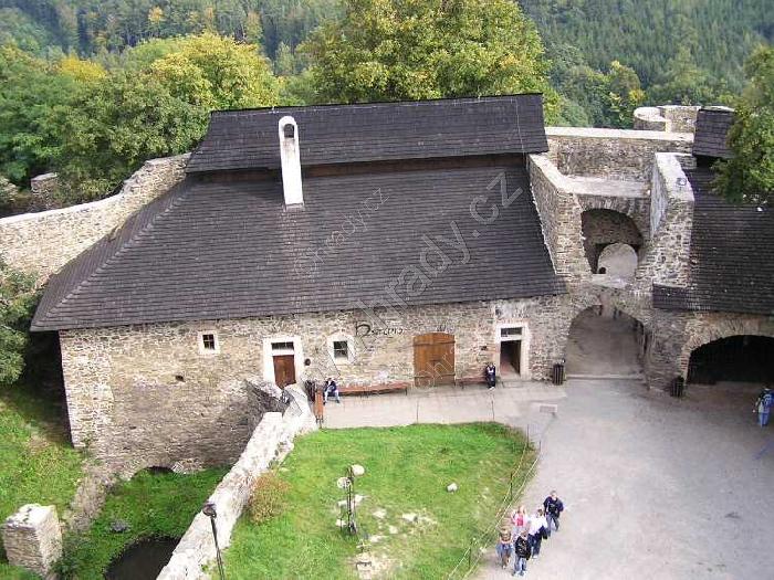 Pohled na nádvorní, jižní, fasádu severního paláce jádra hradu z 5. nádvoříá nejstarší gotickou fázi paláce z dob založení hradu.