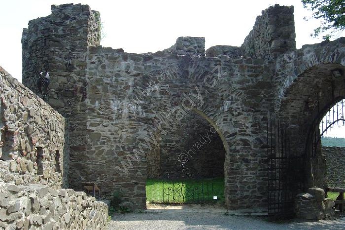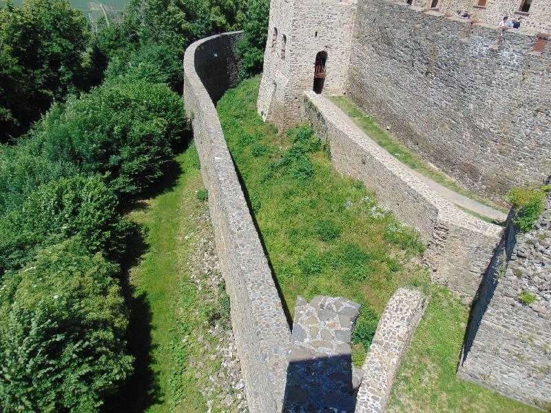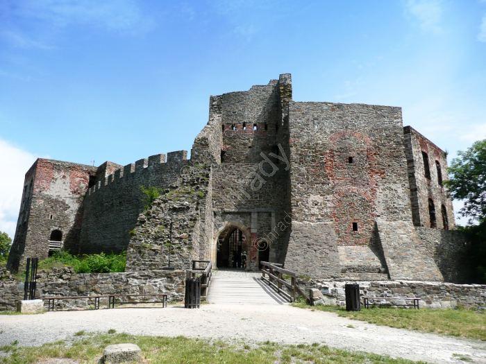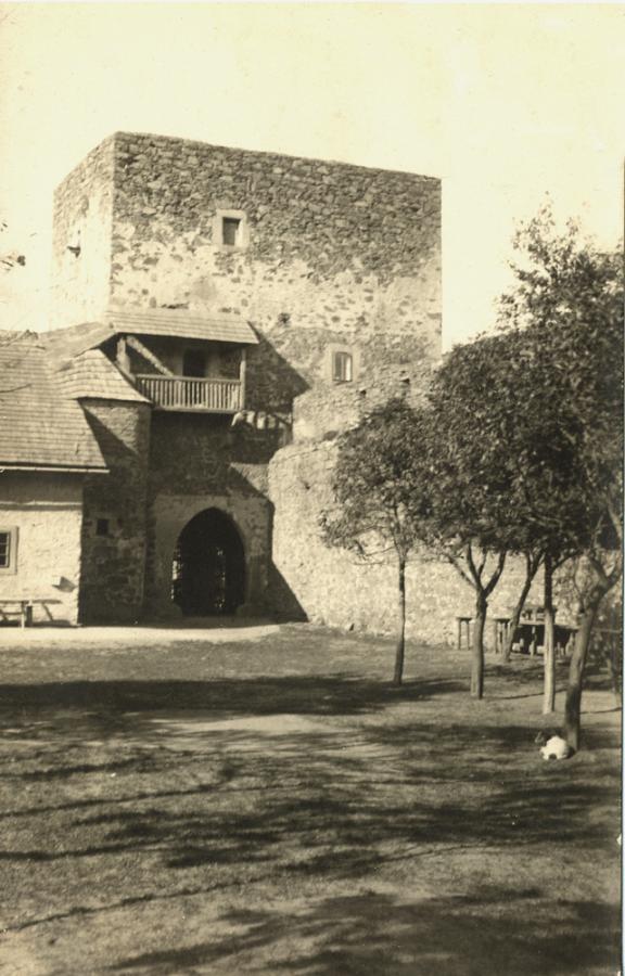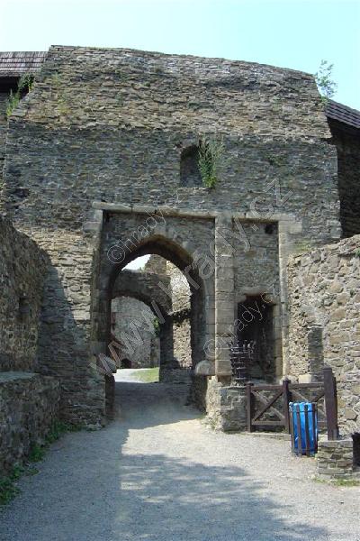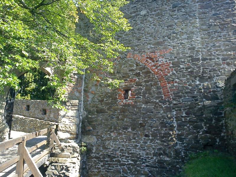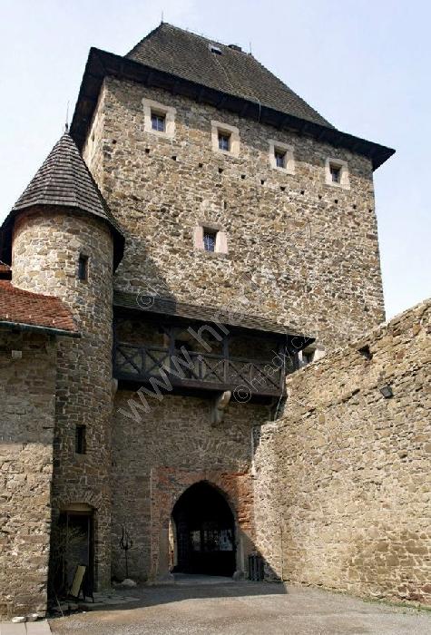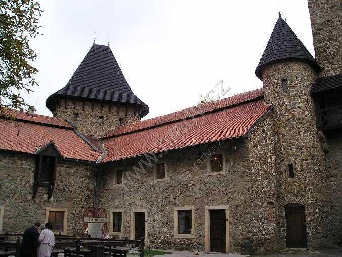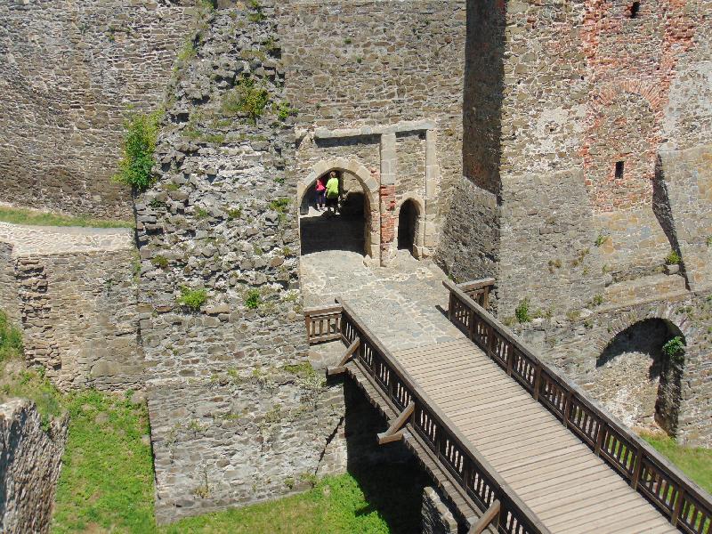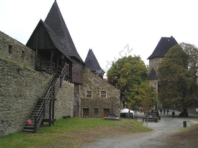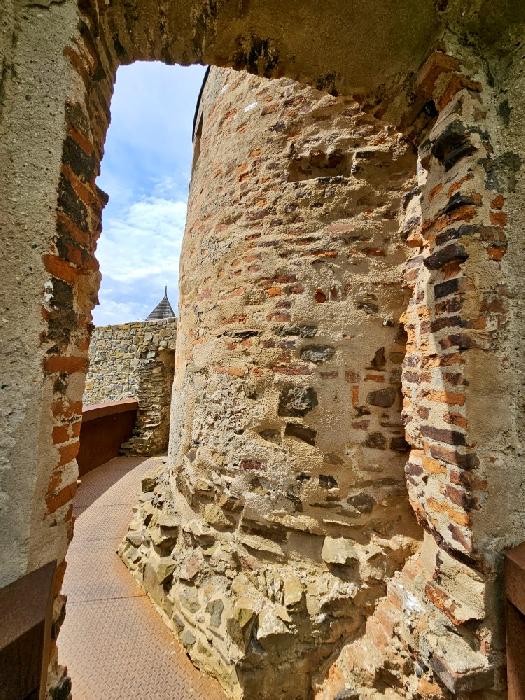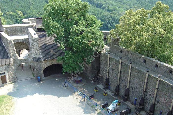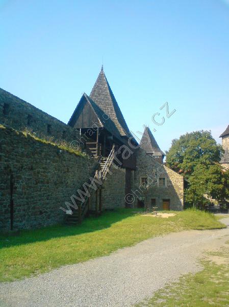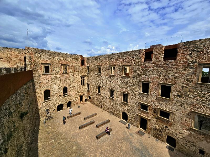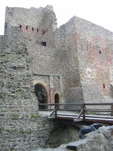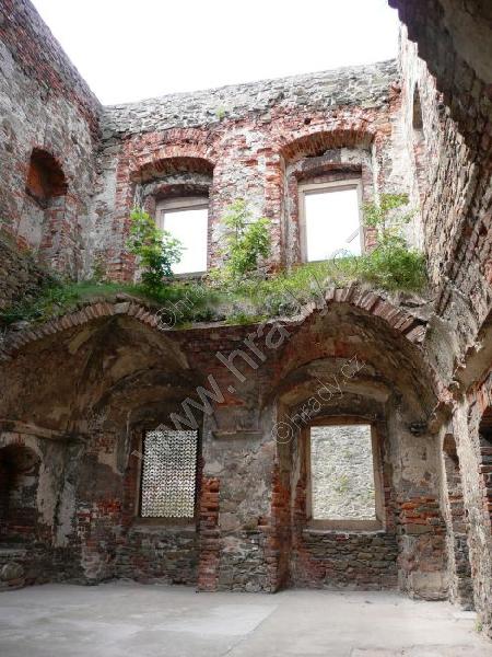 Pohled na nádvorní, jižní, fasádu severního paláce jádra hradu z 5. nádvoříá nejstarší gotickou fázi paláce z dob založení hradu.