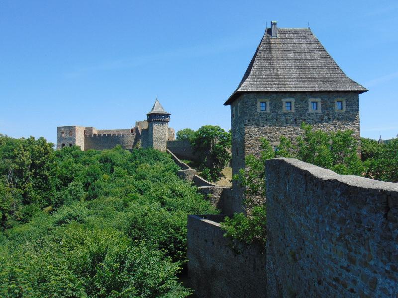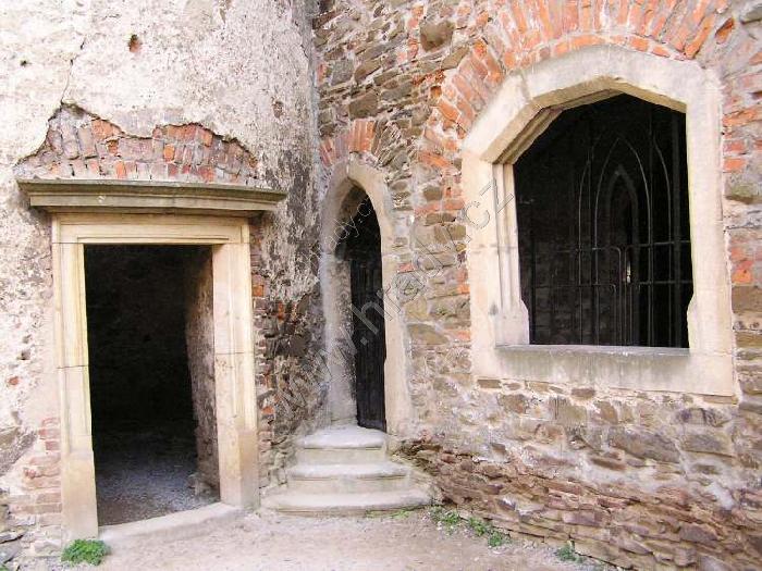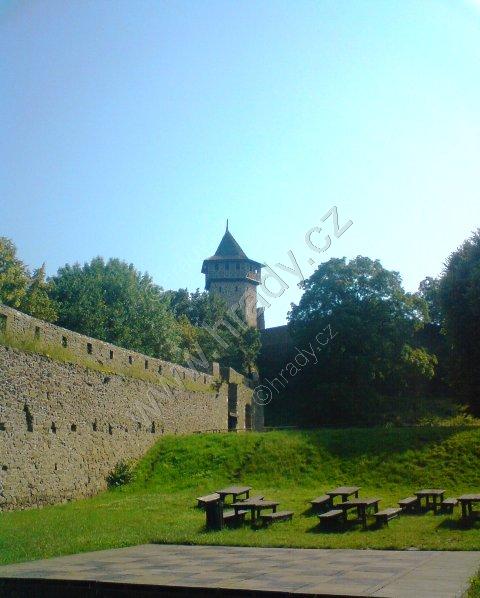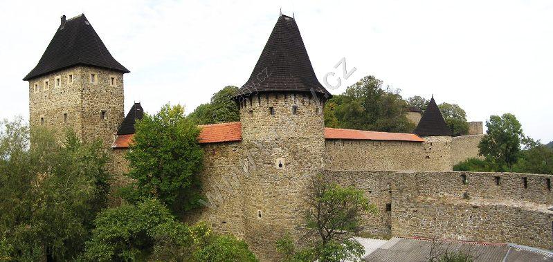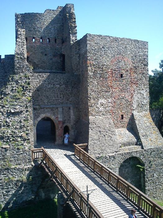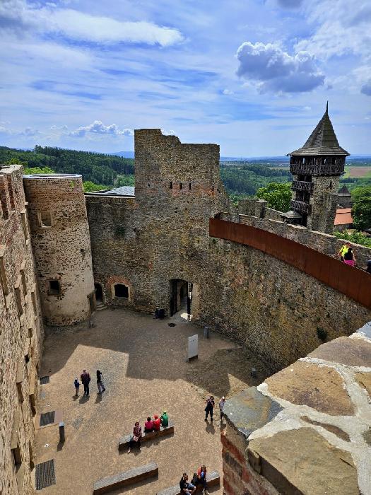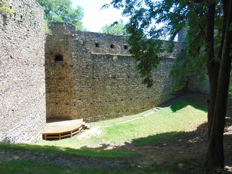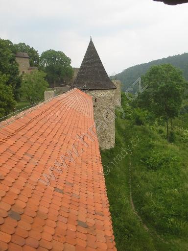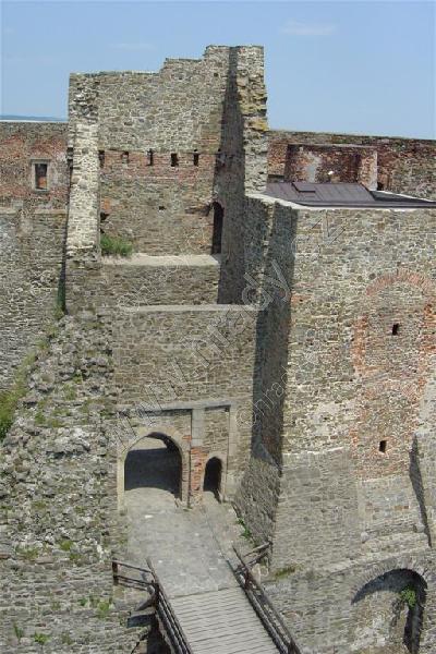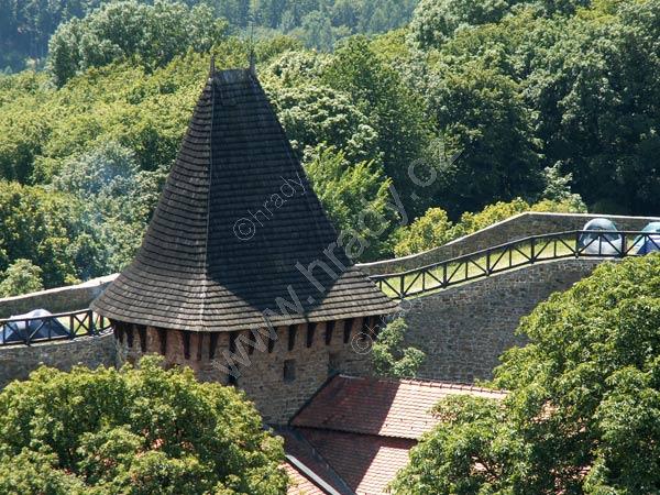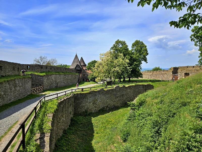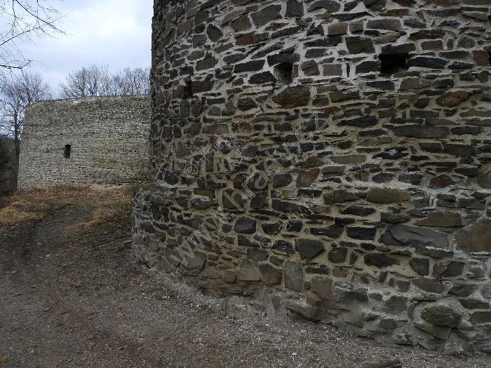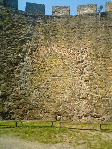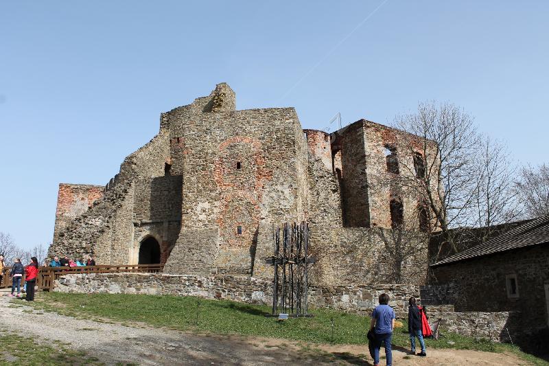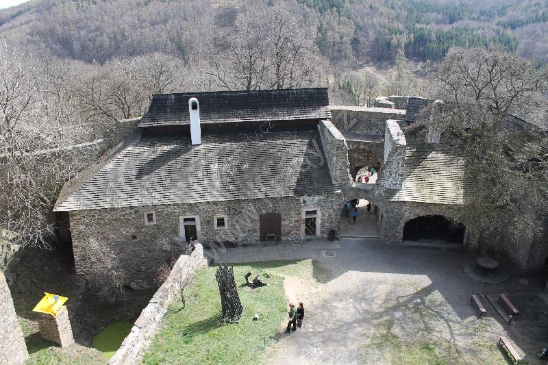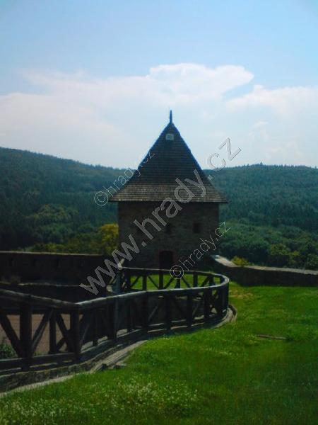 Pohled na nádvorní, jižní, fasádu severního paláce jádra hradu z 5. nádvoříá nejstarší gotickou fázi paláce z dob založení hradu.