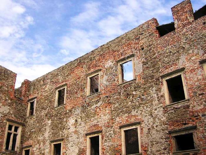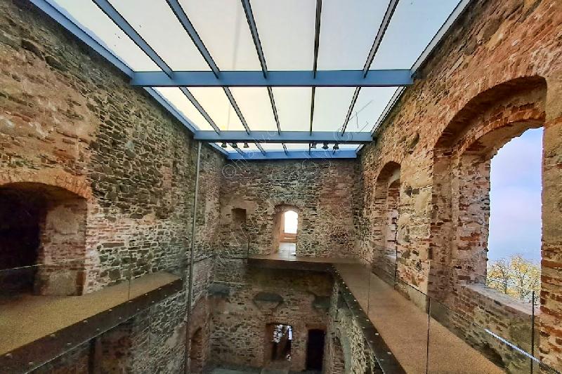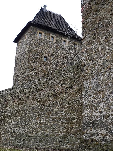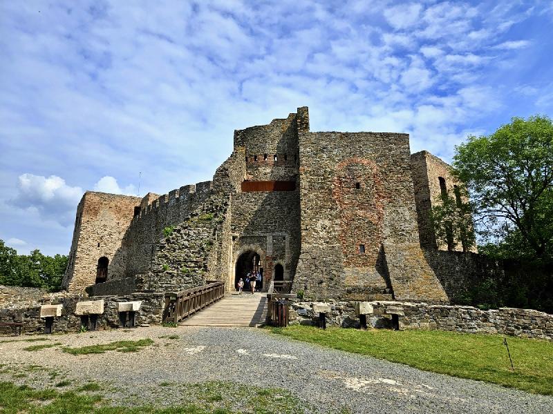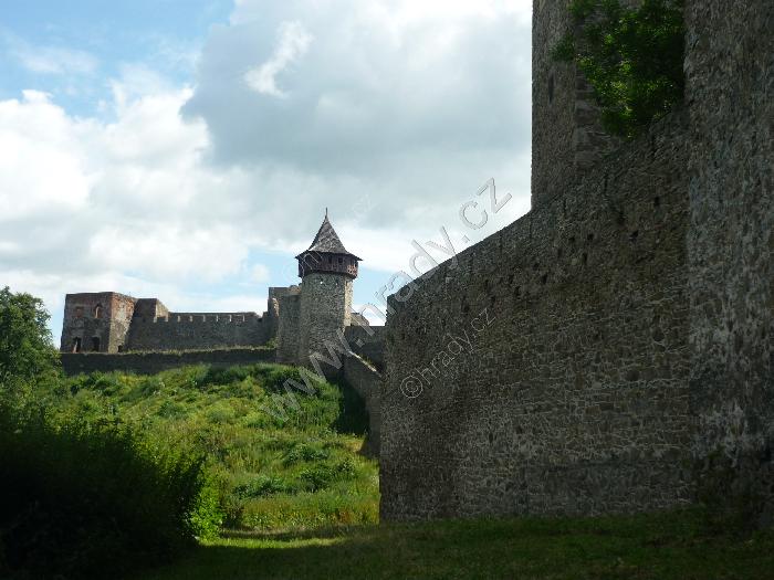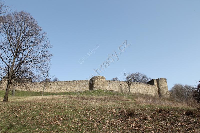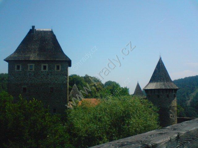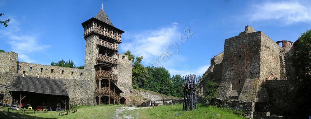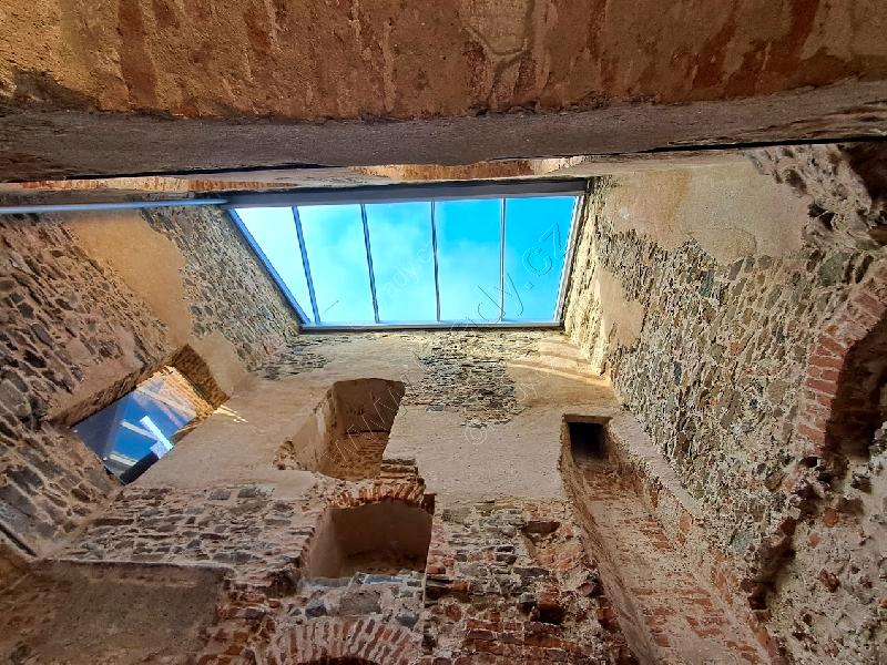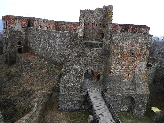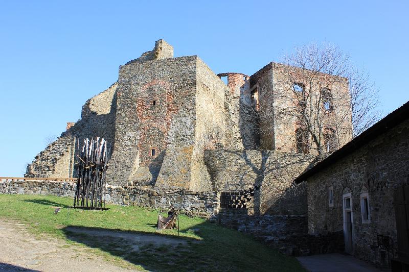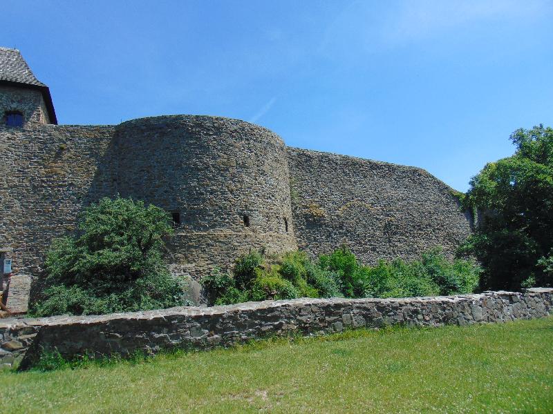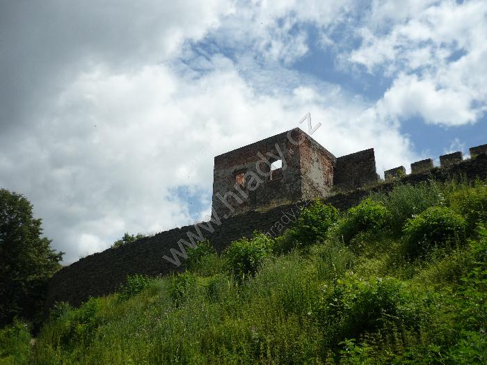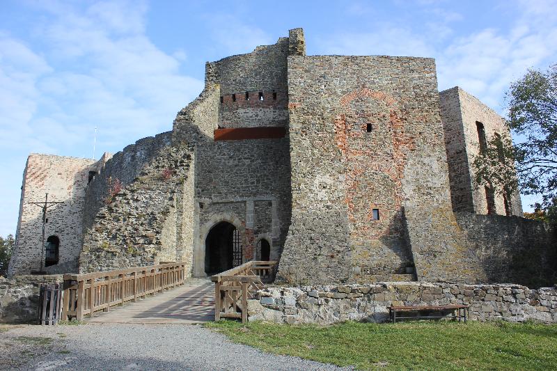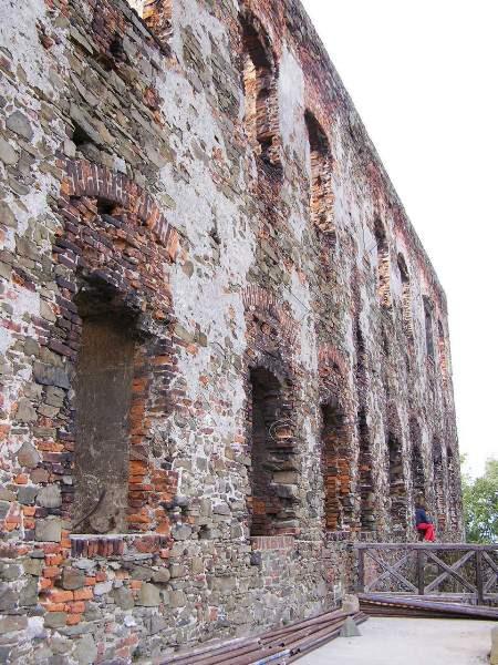 Pohled na nádvorní, jižní, fasádu severního paláce jádra hradu z 5. nádvoříá nejstarší gotickou fázi paláce z dob založení hradu.