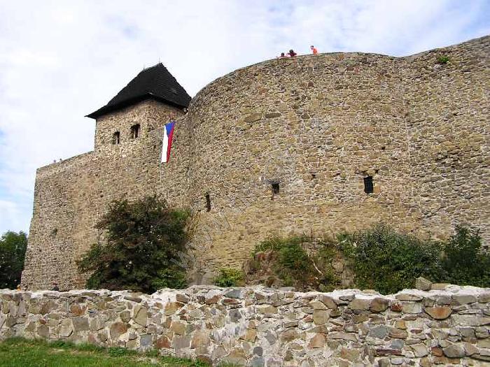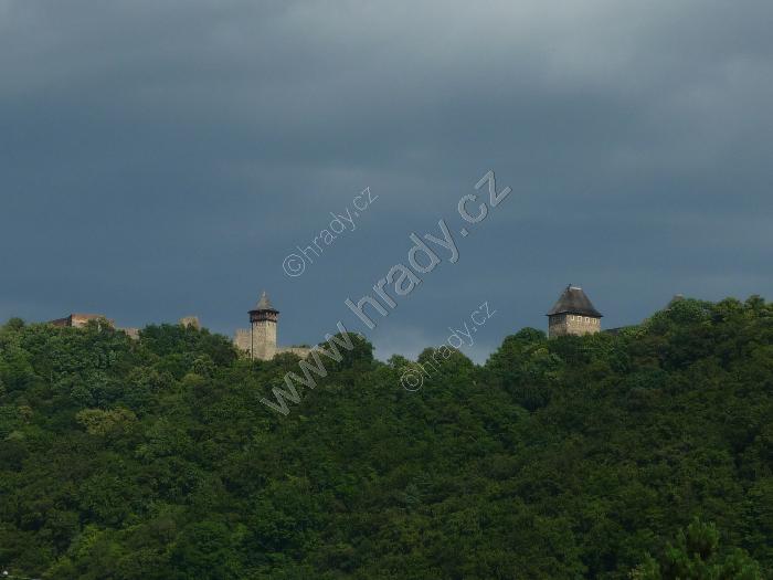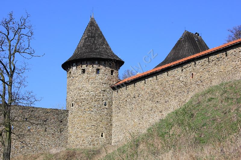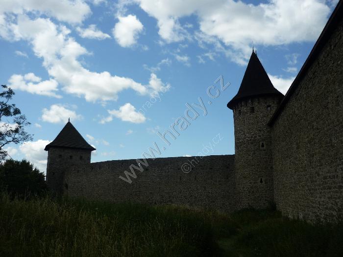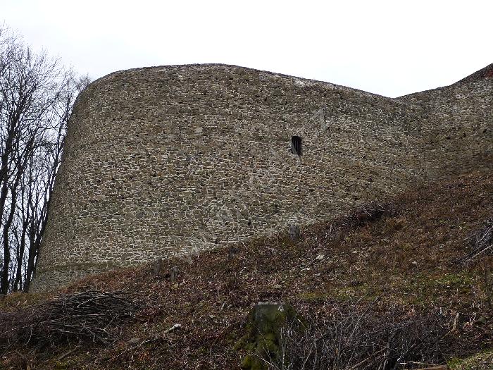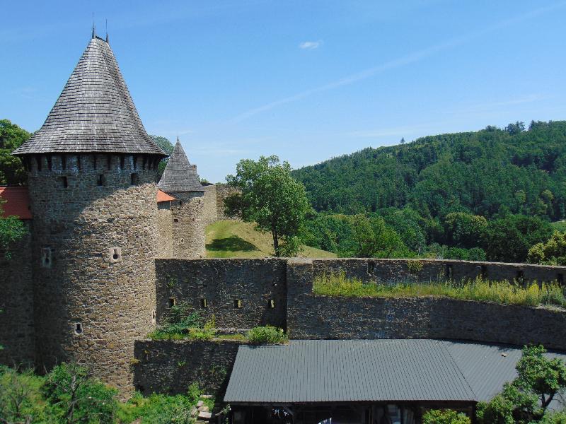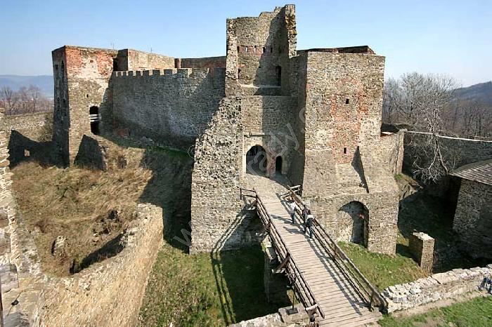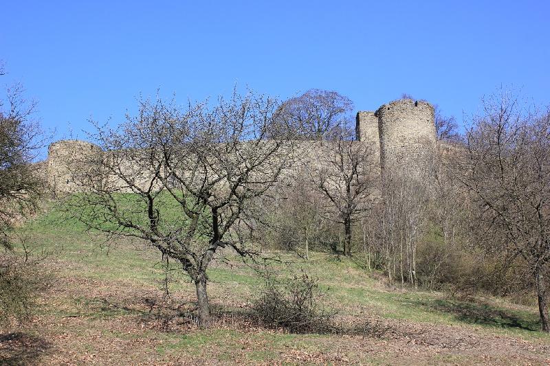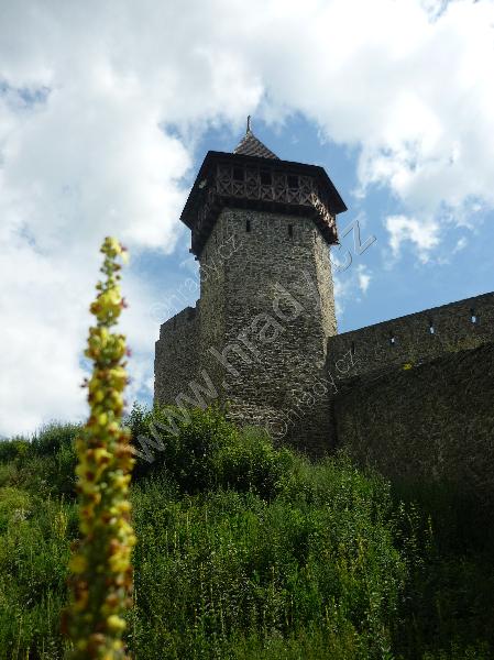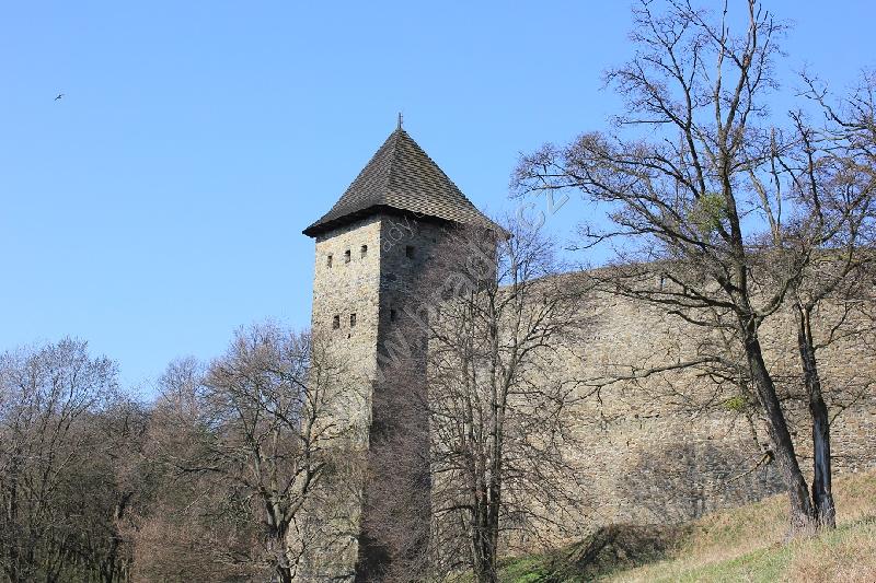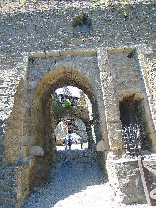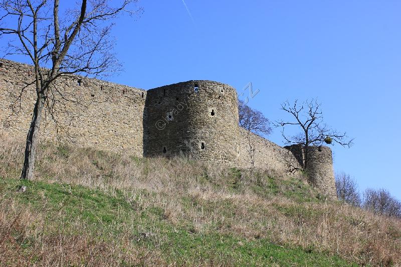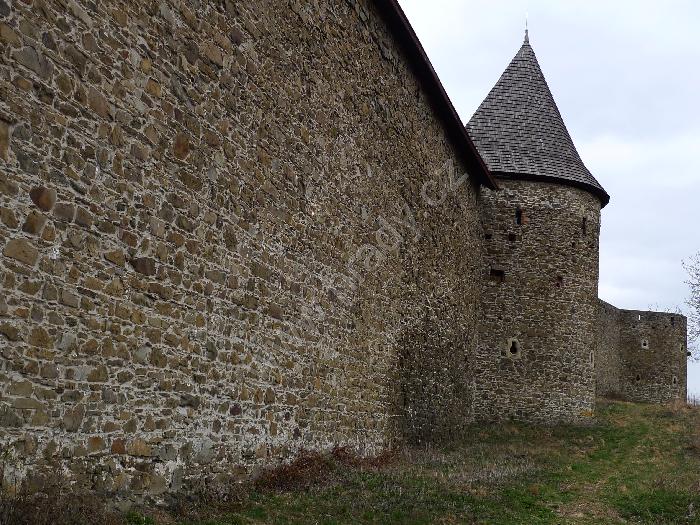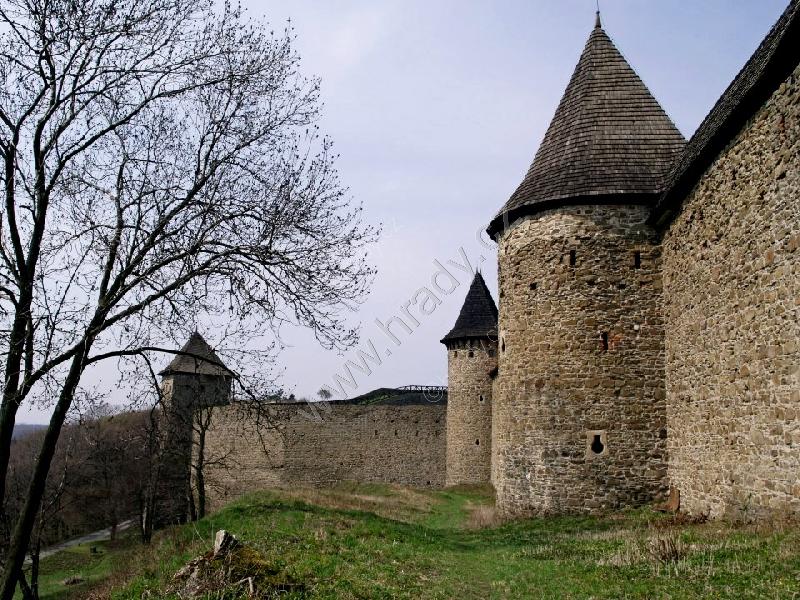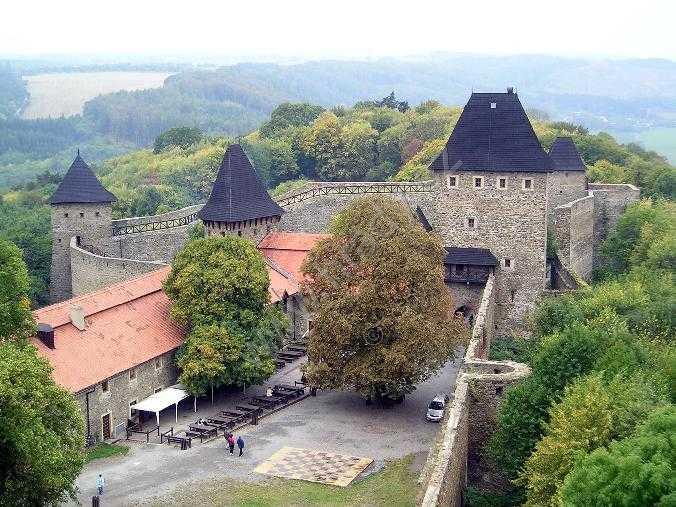 Pohled na nádvorní, jižní, fasádu severního paláce jádra hradu z 5. nádvoříá nejstarší gotickou fázi paláce z dob založení hradu.