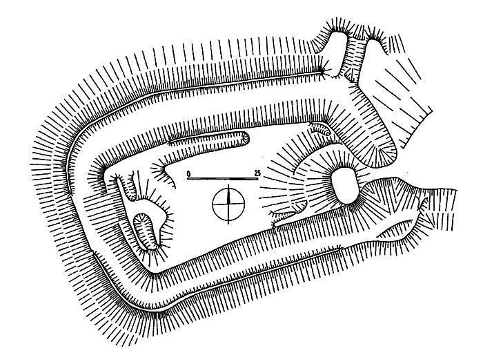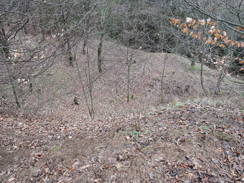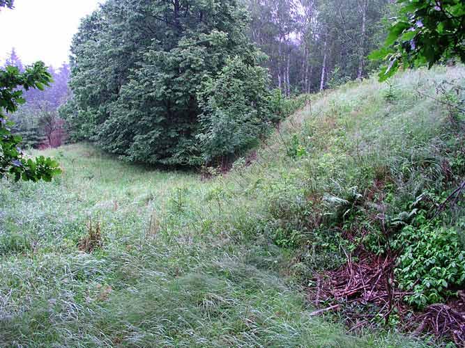 "Vnitřní příkop" podél záp. hradby, ve skutečnosti zřejmě základová deprese po nějakém stavení