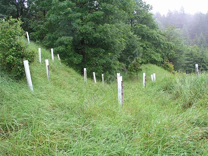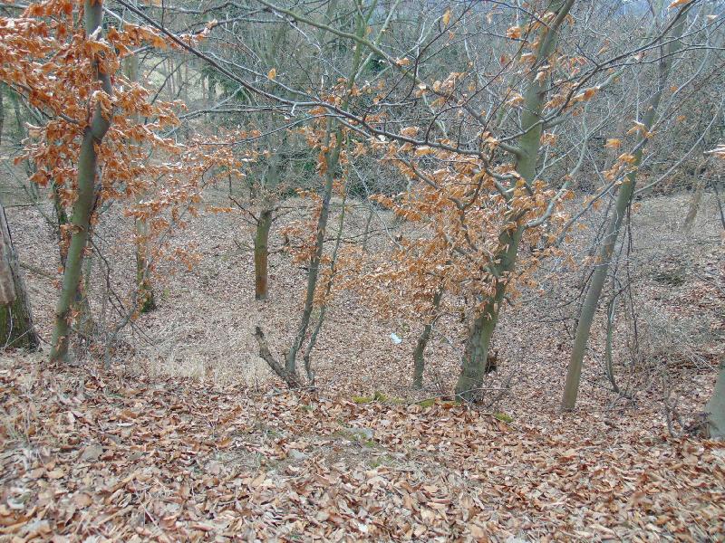 Linie vých. hradby, vlevo příkop, vpravo deprese po možném stavení přiléhající k hradbě