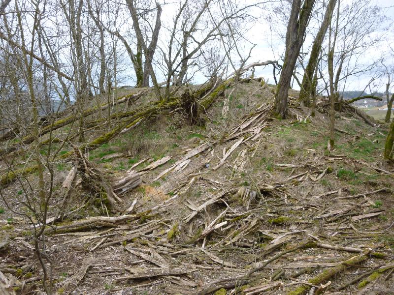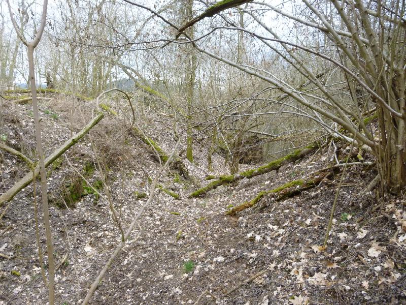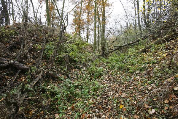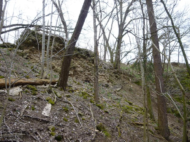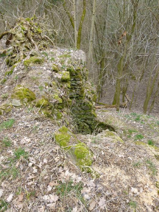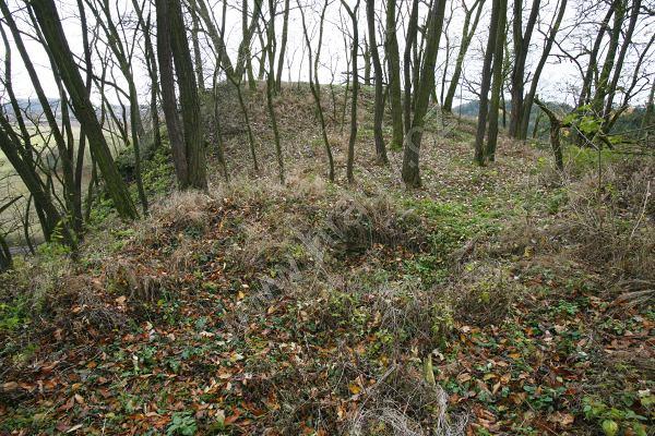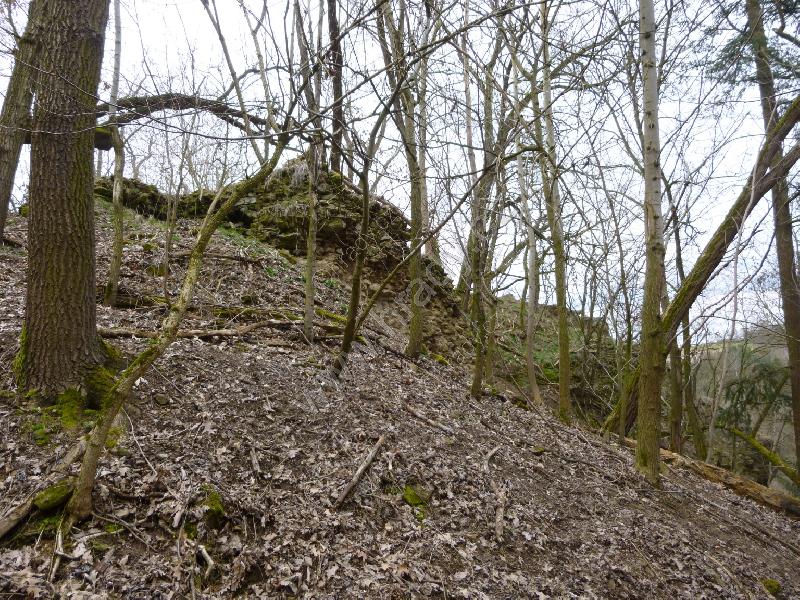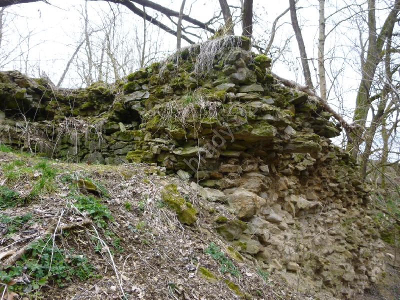 Opadaný venkovní líc hradby na jihozápadní straně dolní části hradu