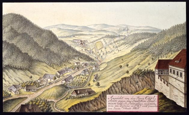 Městečko Karlštejn na obr. I.A.Venuta z roku 1814