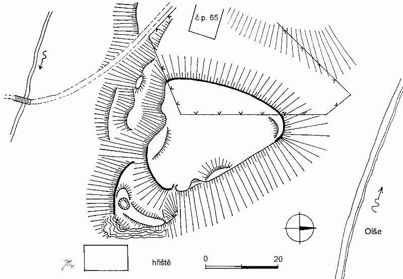 vlevo svah k jádru, uprostřed příkop, vpravo ukončení výběžku