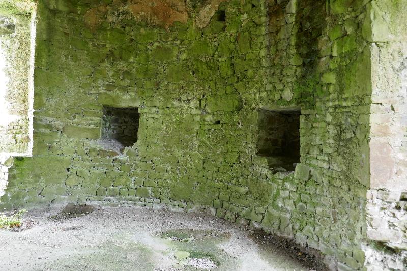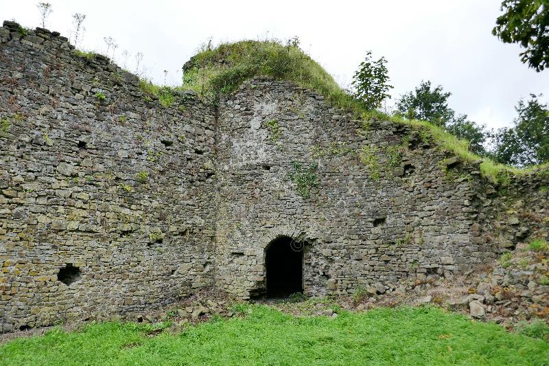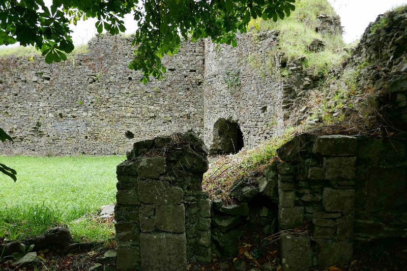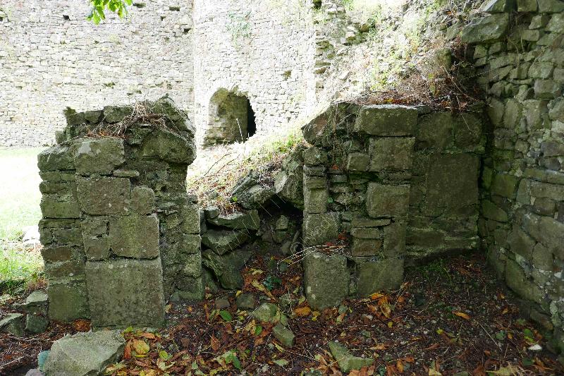 Pozůstatky jediné dnes patrné stavby uvnitř hradu. Ta stála u severozápadní kurtiny (napravo).