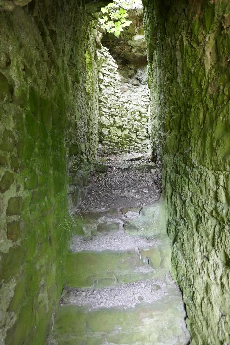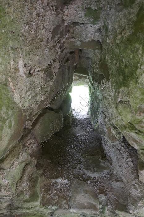Chodba v síle zdi vede z 1. patra jižní věže do její nejvyšší části.
