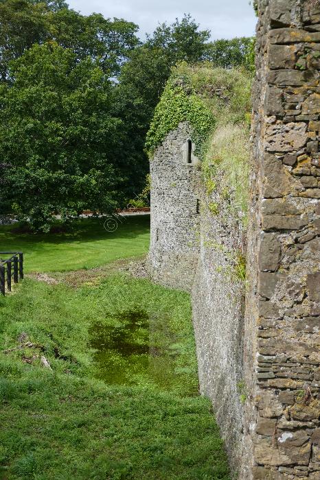 Pohled ze západní věže podél kurtiny na jižní věž. Před hradbou je patrná část vodou naplněného příkopu.