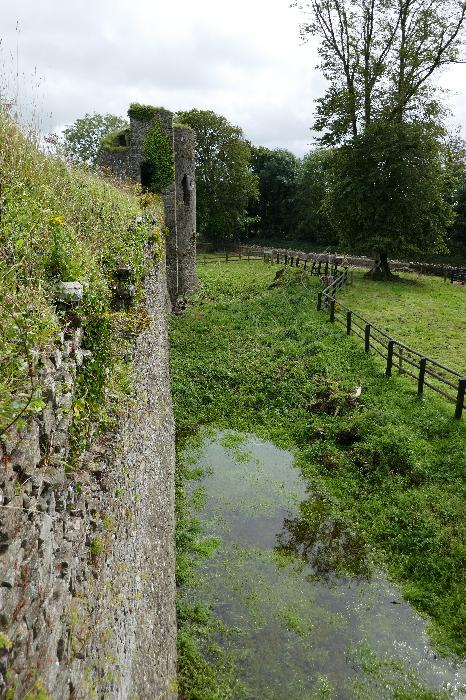 Pohled z jižní věže podél kurtiny na západní věž. Před hradbou je patrná část vodou naplněného příkopu.