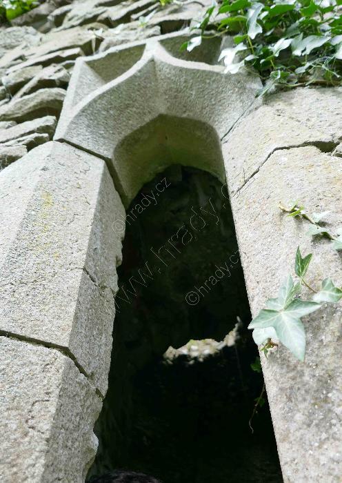 Okno v 1. patře západní věže s oslím obloukem (15. stol).