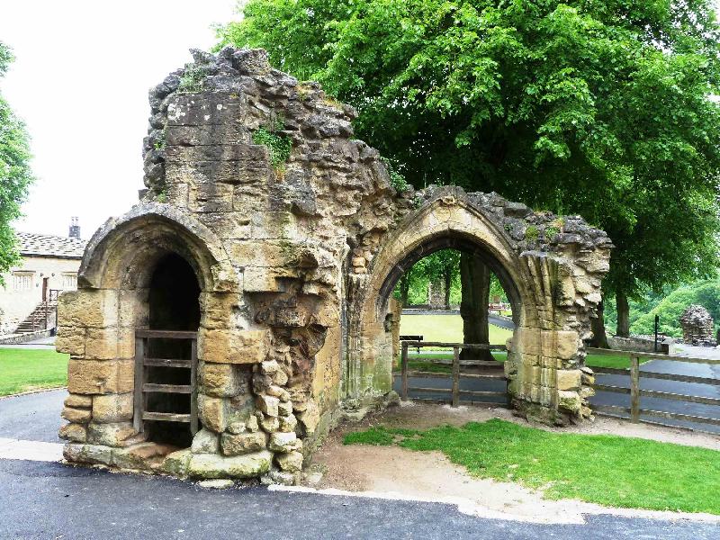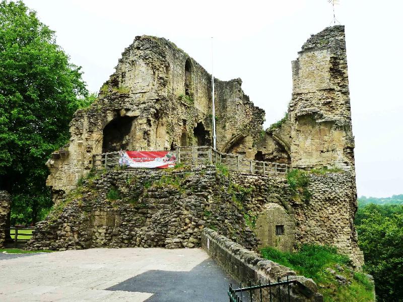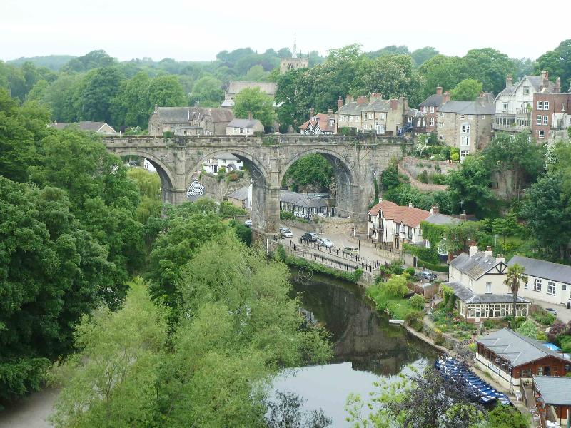 Pohled z hradu do údolí řeky Nidd a na železniční viadukt.