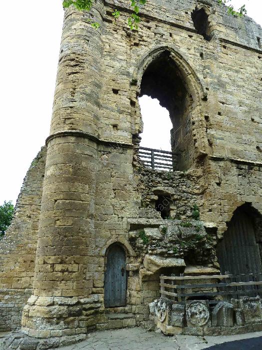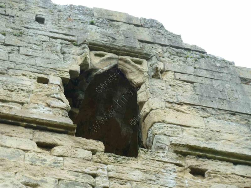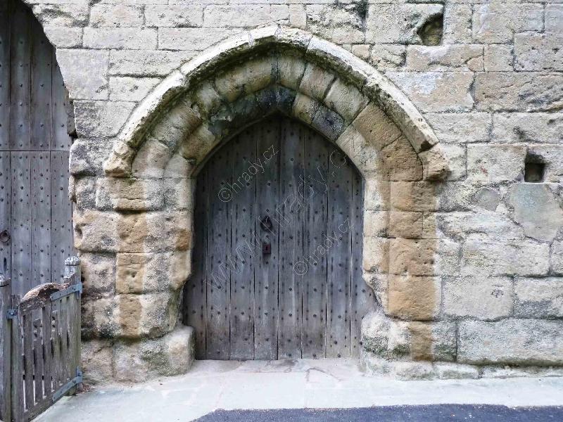 Vstupní portál v prvním patře donjonu. Náběh oblouku ve zdivu pod portálem mohl patřit mostu a nebo schodišti.