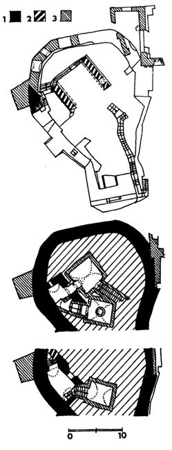 Nahoře přízemí, dole dvě úrovně suterénu. 1 - nejstarší zdivo; 2 - pravděpodobně nejstarší zdivo; 3 - mladší zdivo