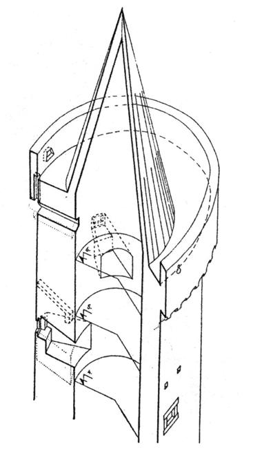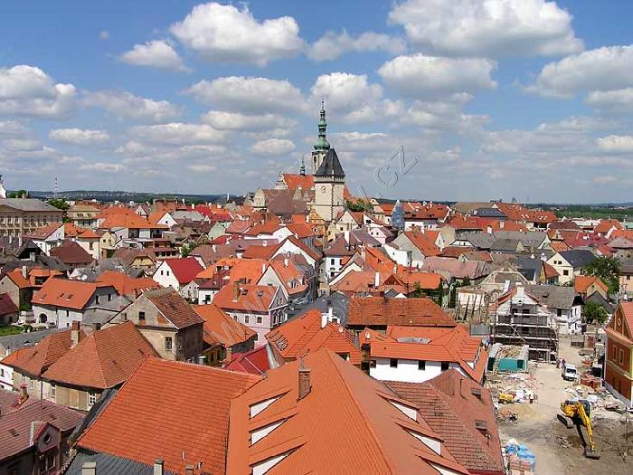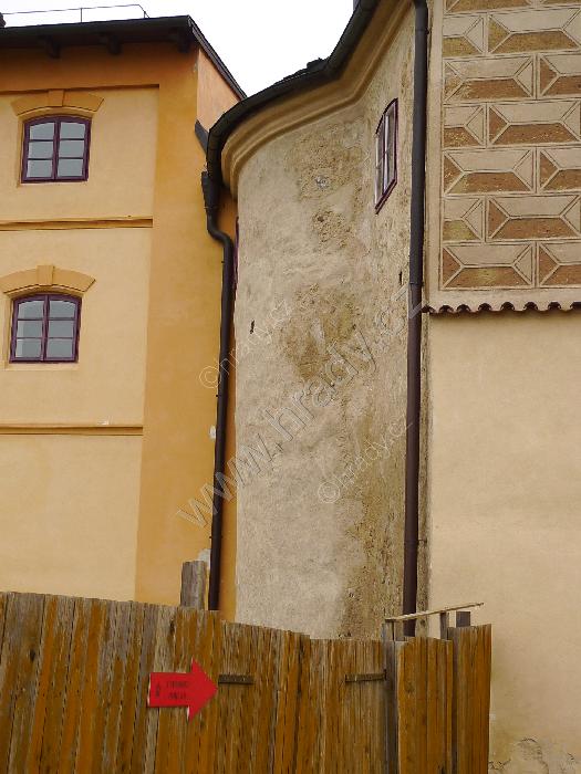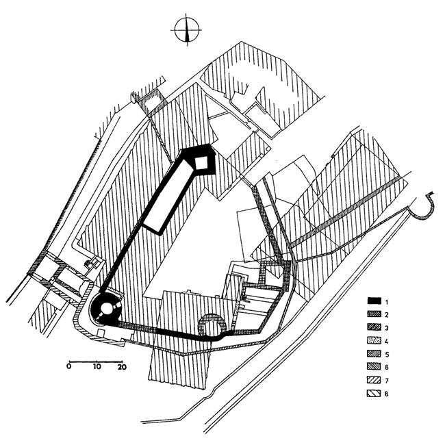 1-dochované zdivo ze 13. století; 2-zaniklé, historickými plány doložené zdivo ze 13. století; 3-předpokládané zdivo ze 13. století; 4-blíže nedatované středověké zdivo; 5-dochované části husitského opevnění; 6- zaniklé, historickými plány doložené části husitského opevnění; 7-přestavba z doby okolo roku 1430; 8-současná zástavba