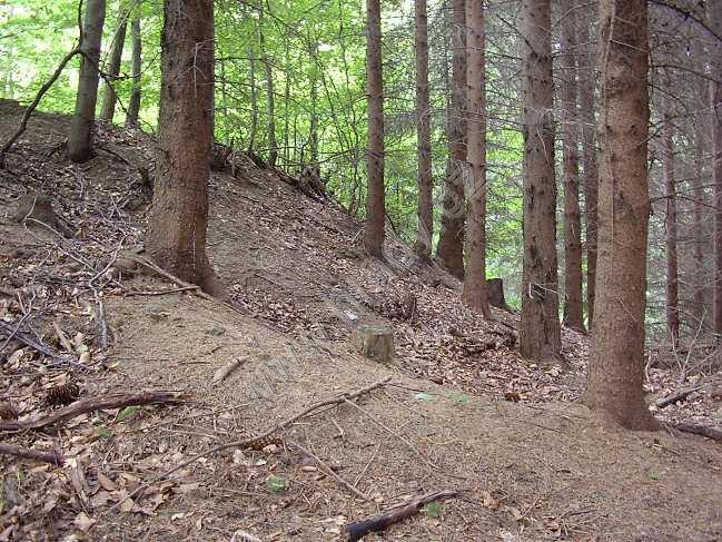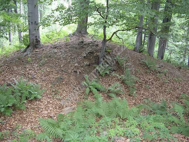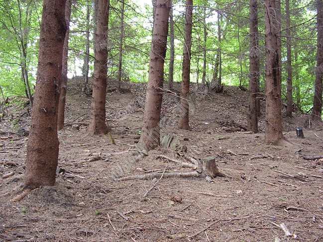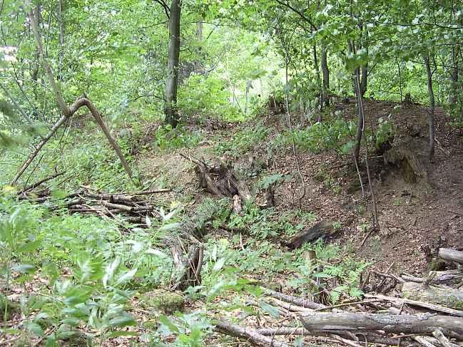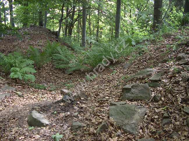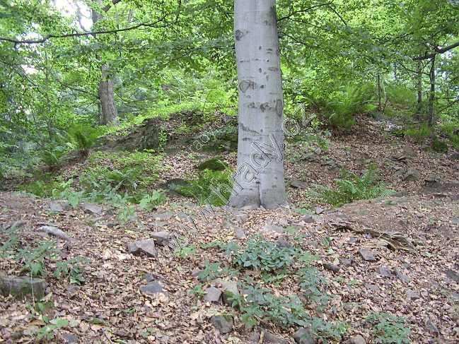 Jeden z mála zbytků zdiva v prohlubni uprostřed areálu.