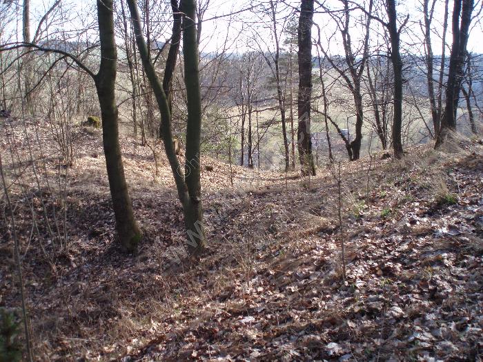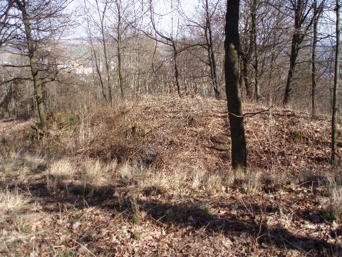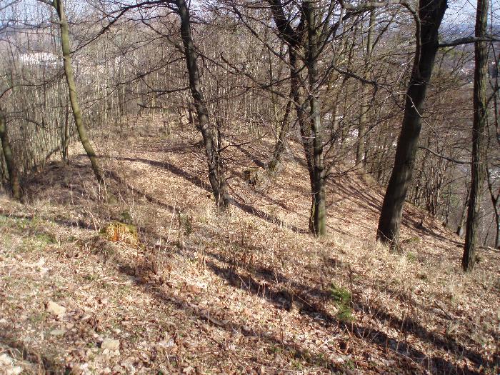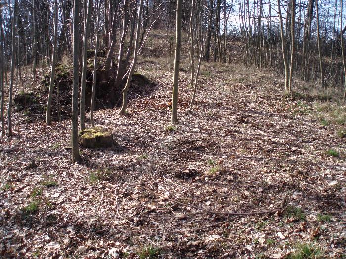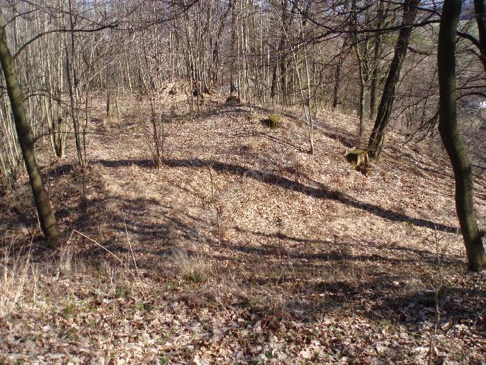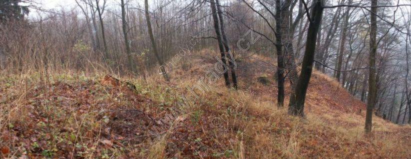 Vnitřní val a příkop v půlkruhu chránící jádro hradu. Pohled od západní strany.