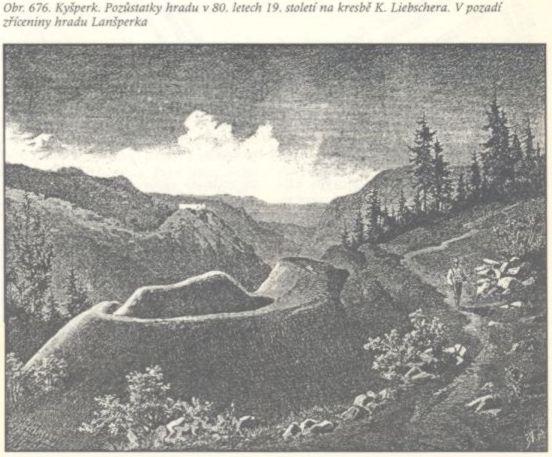 Pozůstatky hradu v 80.letech 19. století na kresbě K.Liebschera.