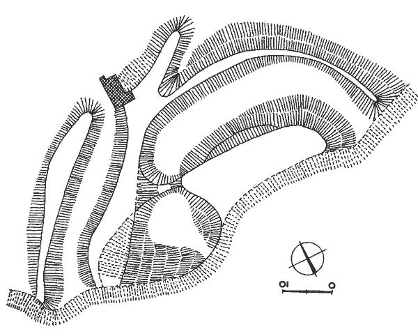 Vnitřní příkop s přístupovou cestou, pohled od severu k jihu.