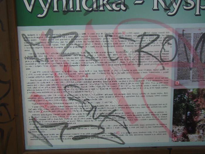 Nedávno instalovaná tabule s informacemi o hradě a archeologickém výzkumu nevydržela dlouho nepoškozená...
