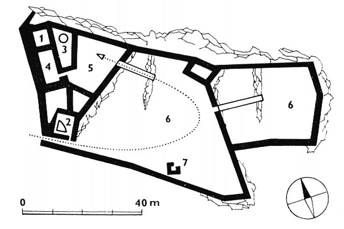 Popis: 1-věž, 2-tzv. kovárna, 3-cisterna na vodu, 4-palác, 5-nádvoří horního hradu, 6-plocha dolního hradu
