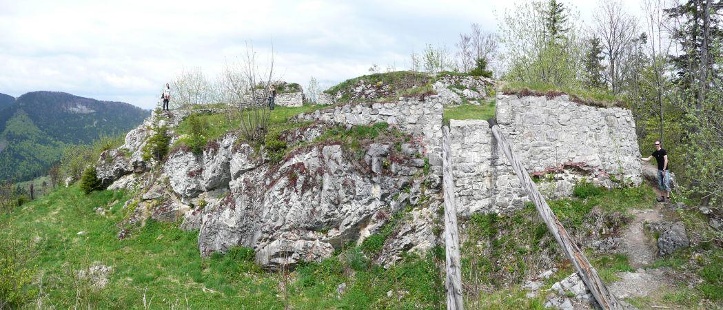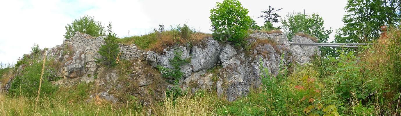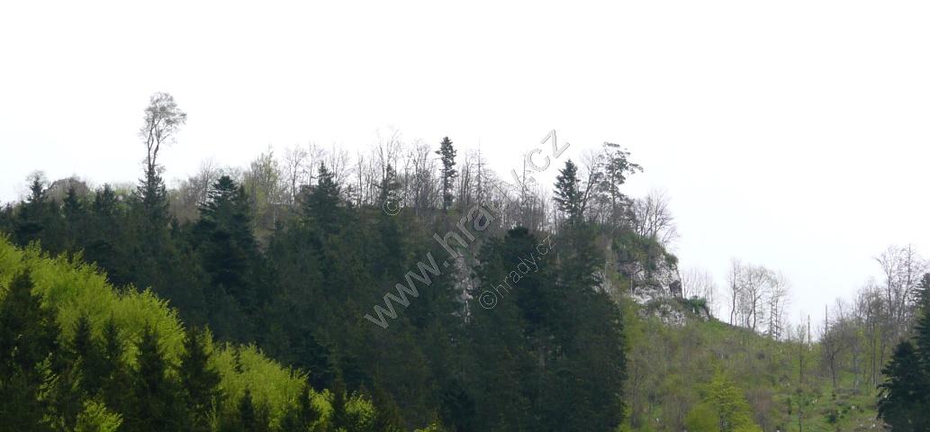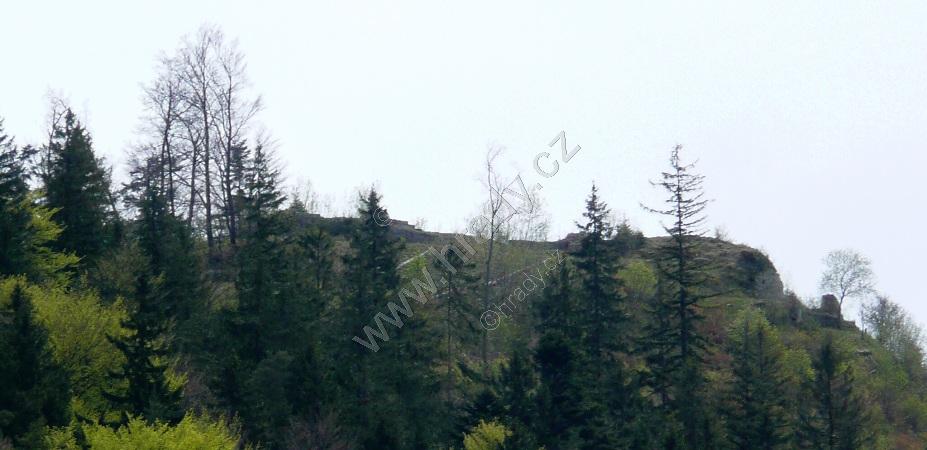 pohled od jihu: v levé části vlastní hrad, vpravo zřetelné zakončení skalami, které odtud dělaly hrad nedobytným