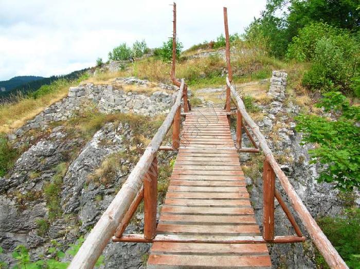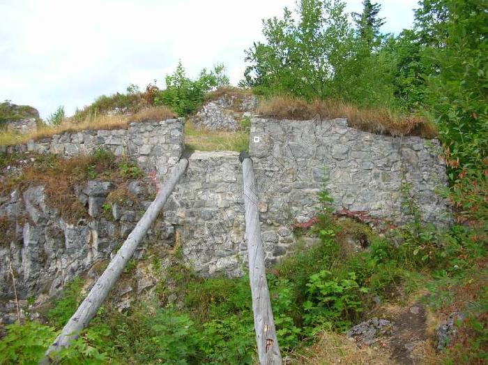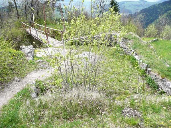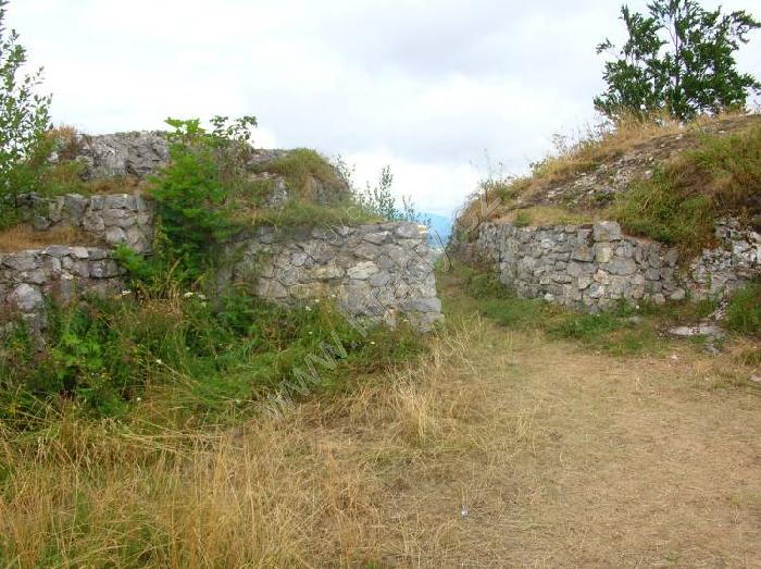 pohled přes menší, ve skále vylámaný příkop na bránu do hradu
