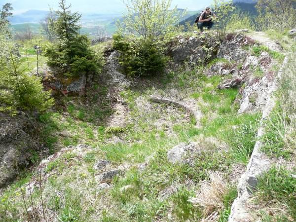 Ve skále vylámaný příkop mezi dolním a horním hradem (vlevo)