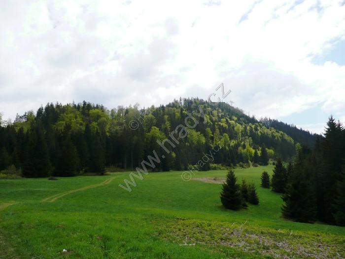 Pohled na hradní vrch od jihu z vesnice Kalameny