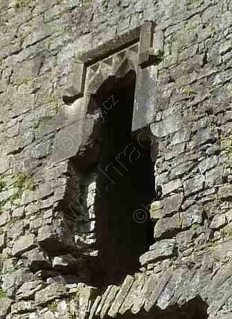 Pozdně středověké dvojité okno s oslími oblouky a kamenným okapem.