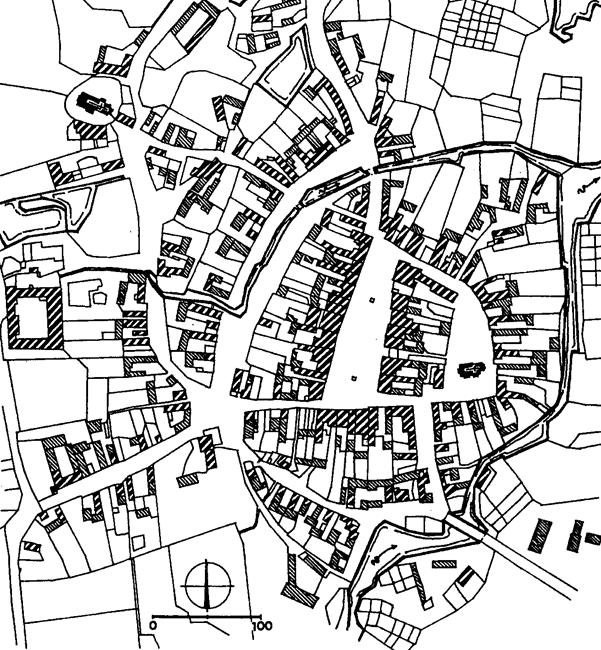 Černě gotické zdivo, šrafovaně barokní zdivo