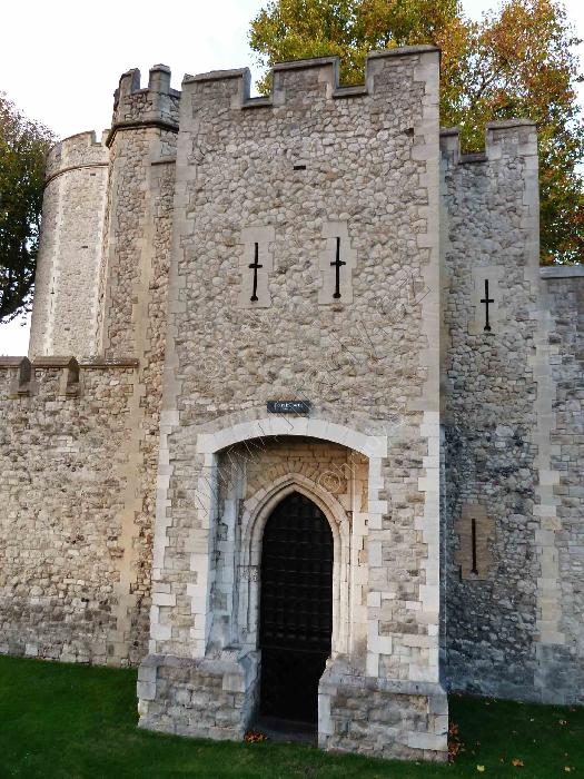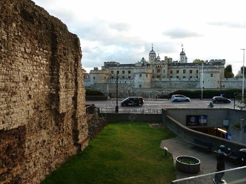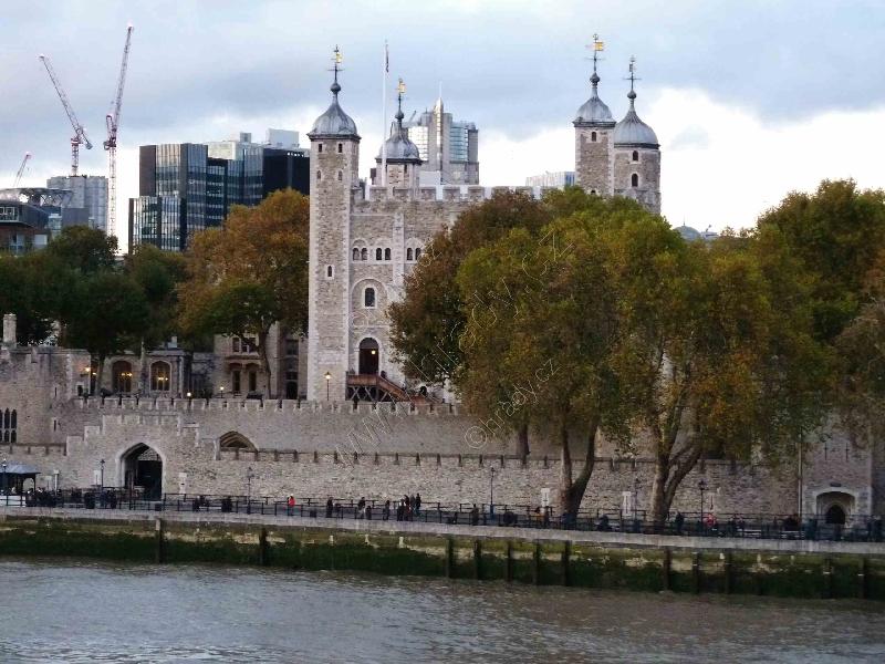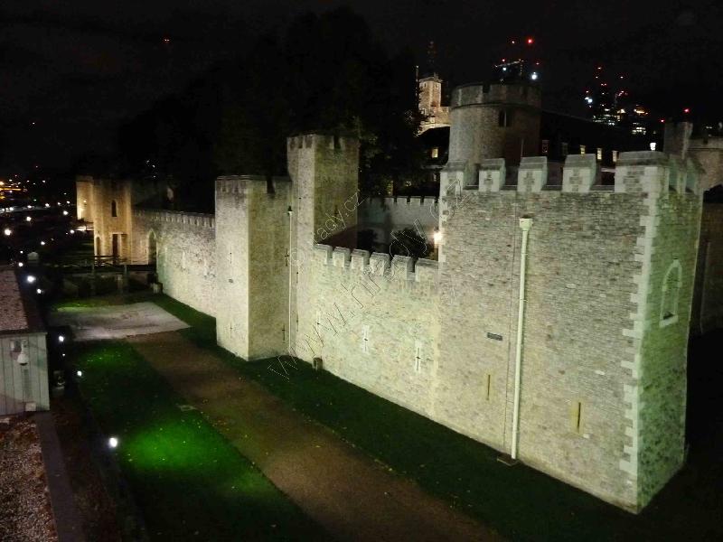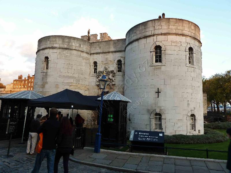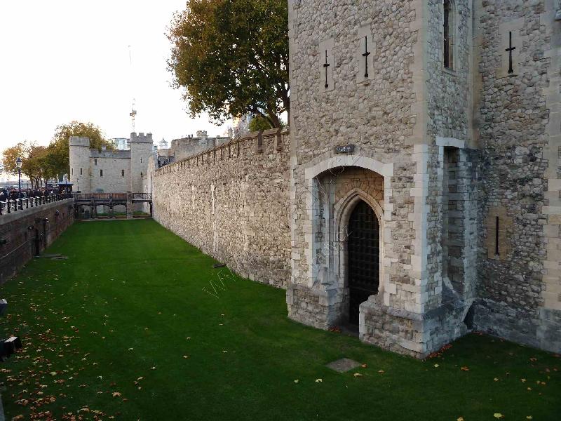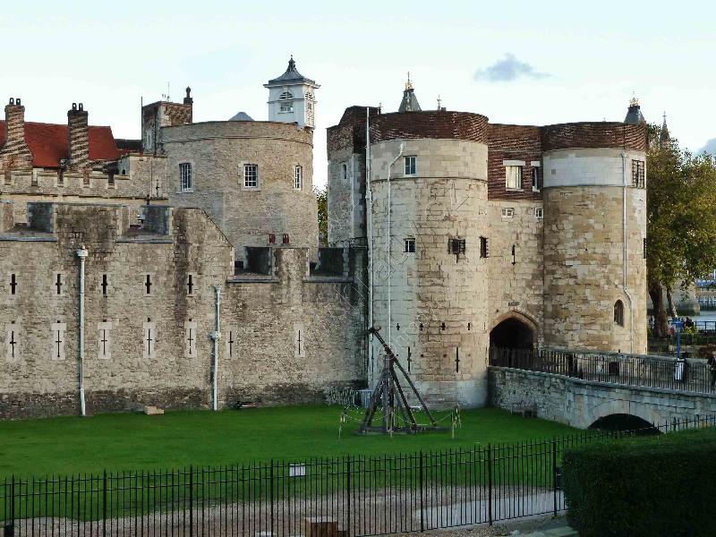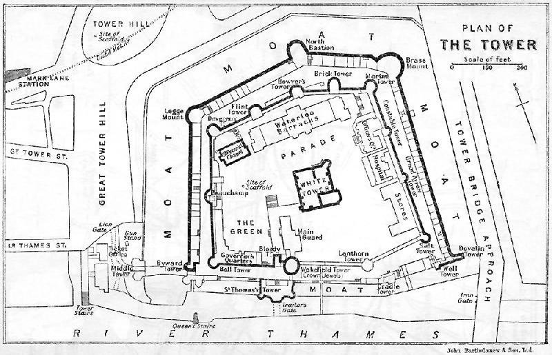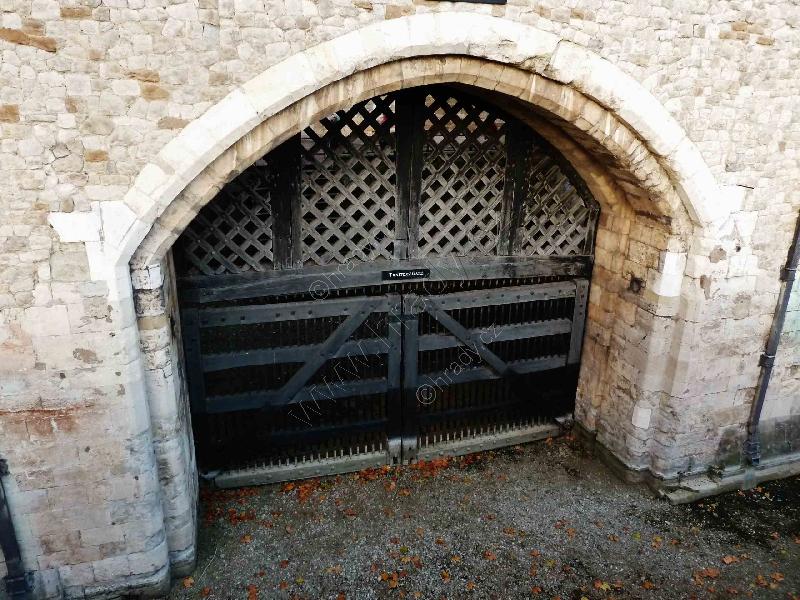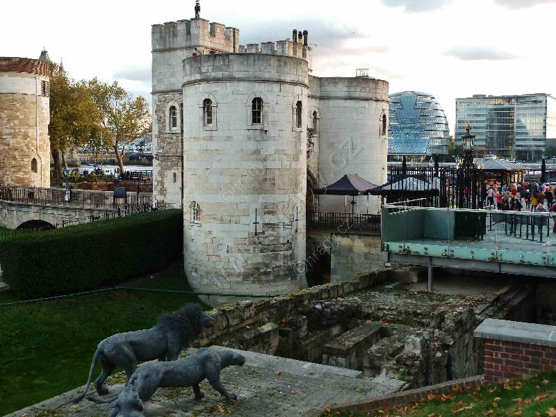 Opevněné předmostí první brány z pokročilého 13. stol. Před bránou předmostí stál barbakán zvaný Lví věž, odtud sochy lvů na popředí. Ti mají namířeno na první most do barbakánu. Přední část mostu byla padací. Úplně vzadu je vidět zaoblená skleněná budova londýnské radnice.