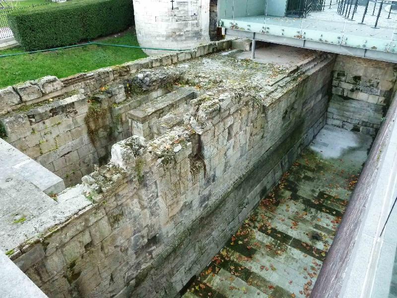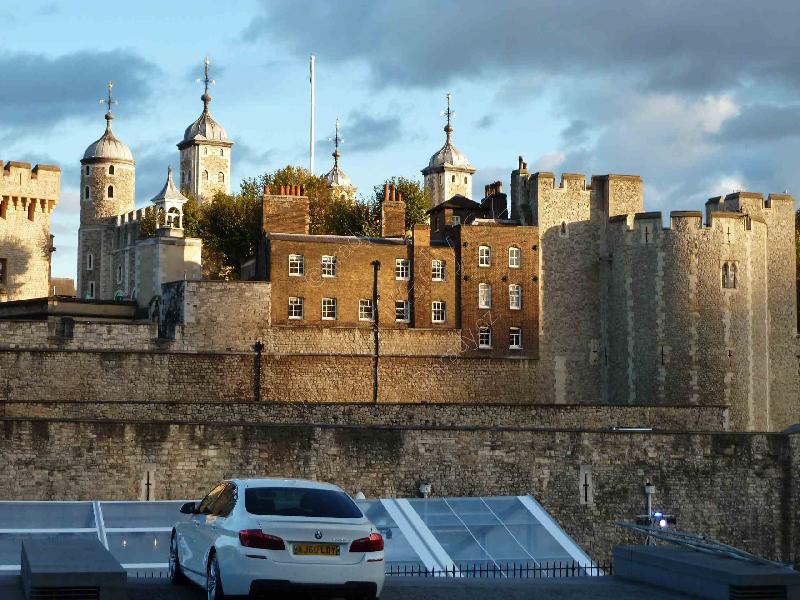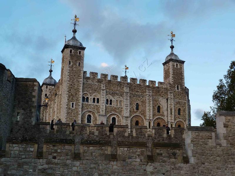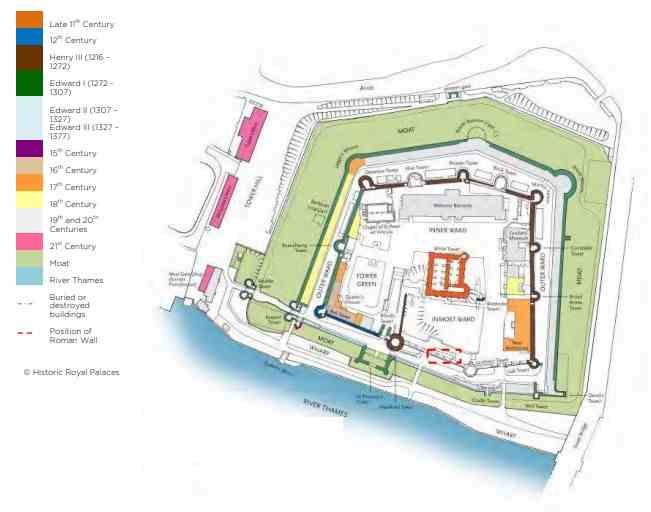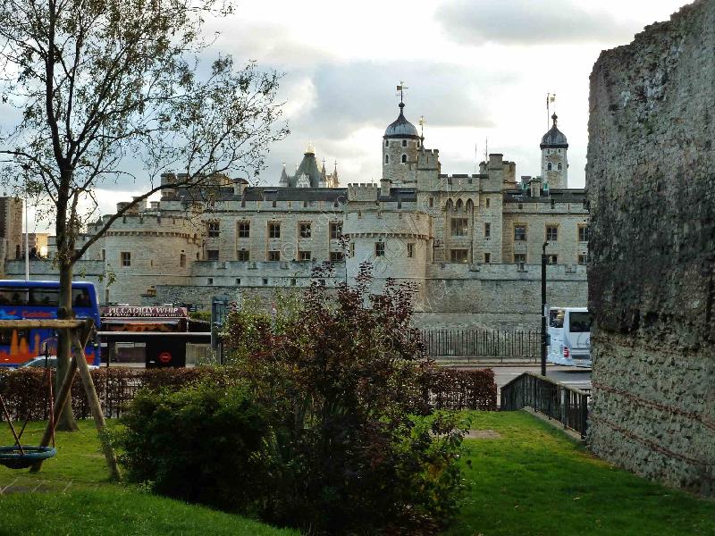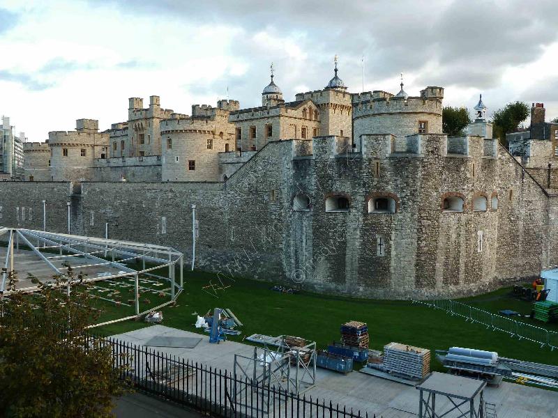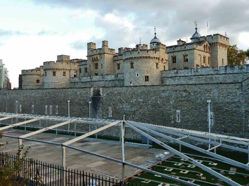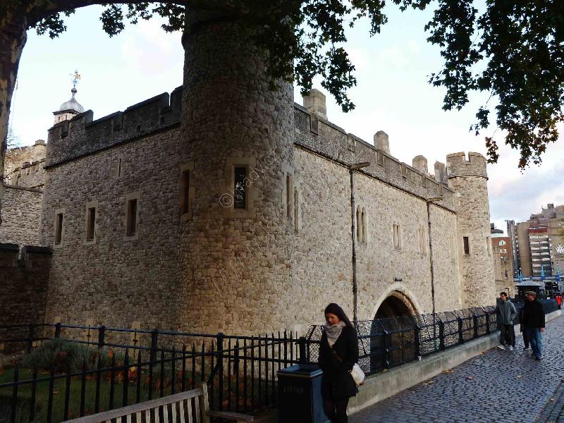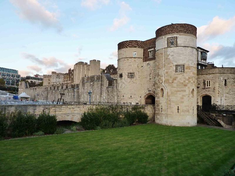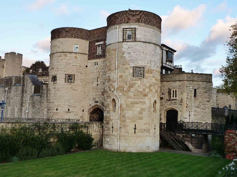 Opevněné předmostí první brány z pokročilého 13. stol. Před bránou předmostí stál barbakán zvaný Lví věž, odtud sochy lvů na popředí. Ti mají namířeno na první most do barbakánu. Přední část mostu byla padací. Úplně vzadu je vidět zaoblená skleněná budova londýnské radnice.