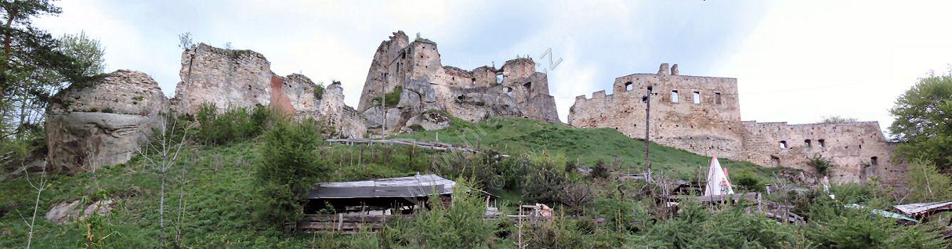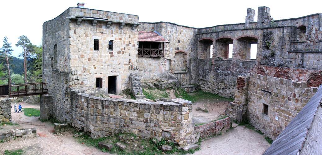 zleva odrzykońské předradí, horní hrad, střední hrad a korczyńské předhradí