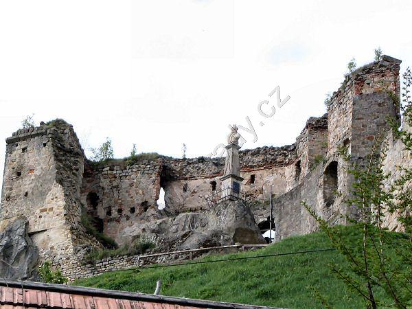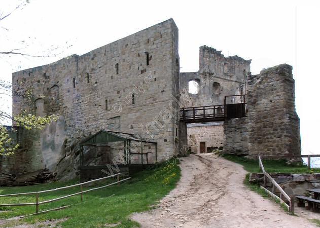 vlevo severní hradba středního hradu, vpravo horní hrad