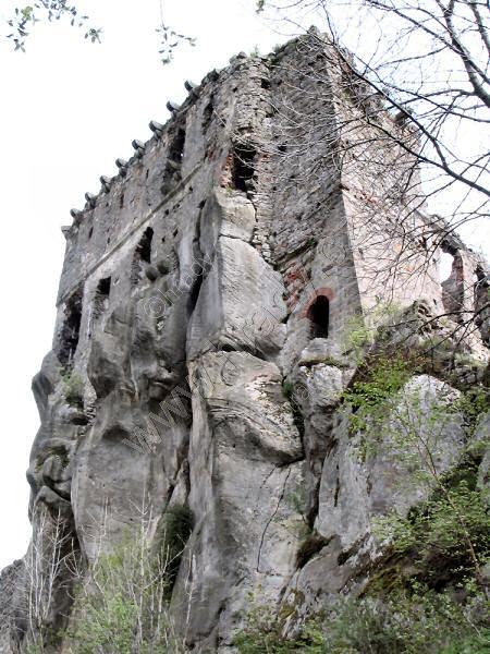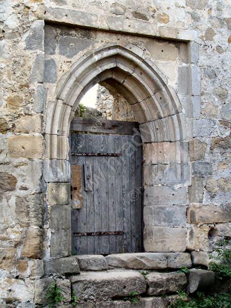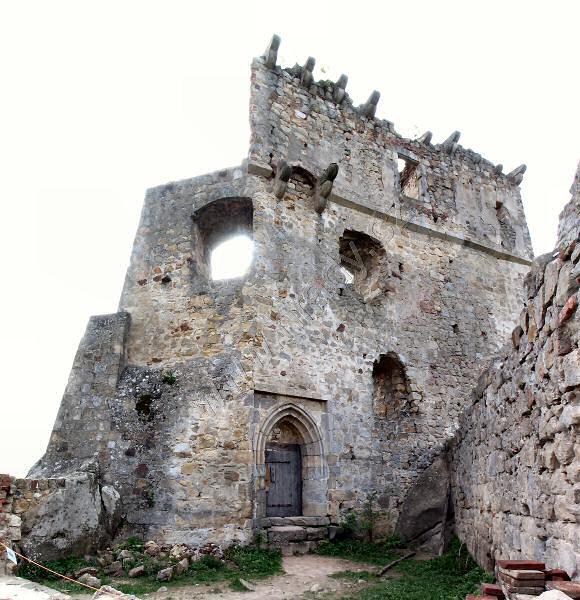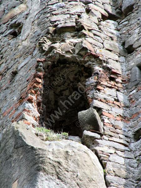 dole vstupní portál, ve 2. patře zbytky arkýře a nad ním krakorce obranného ochozu