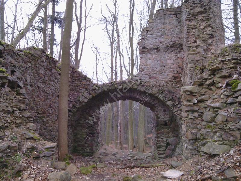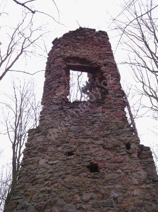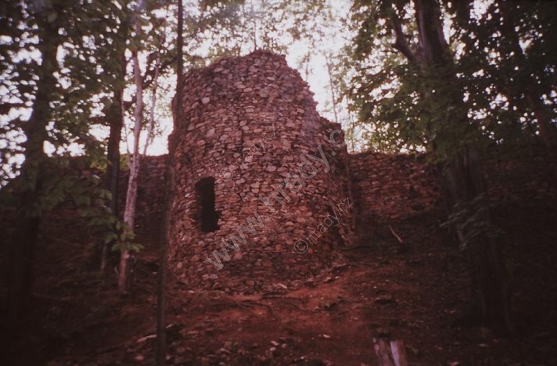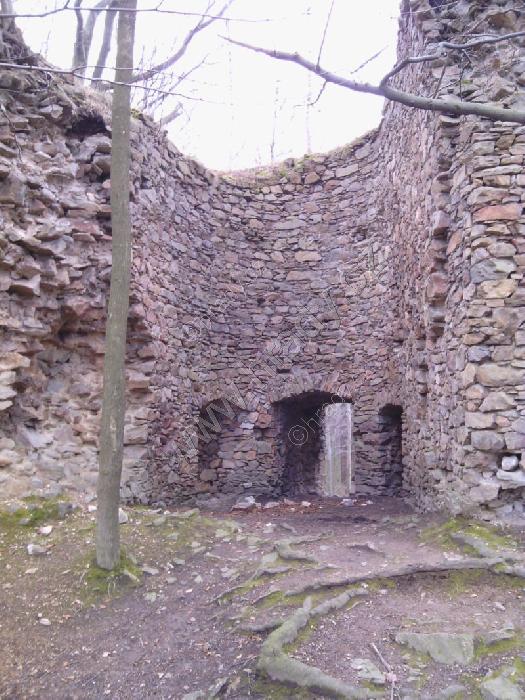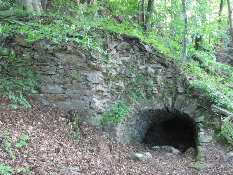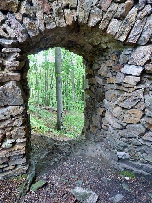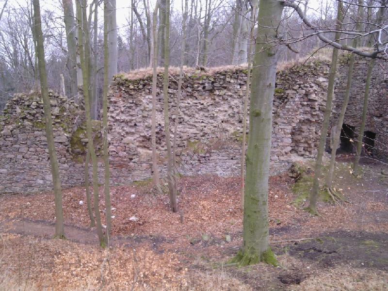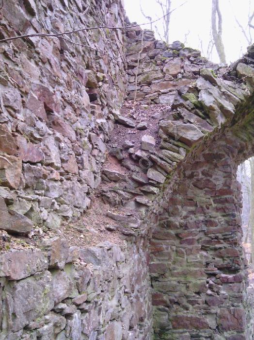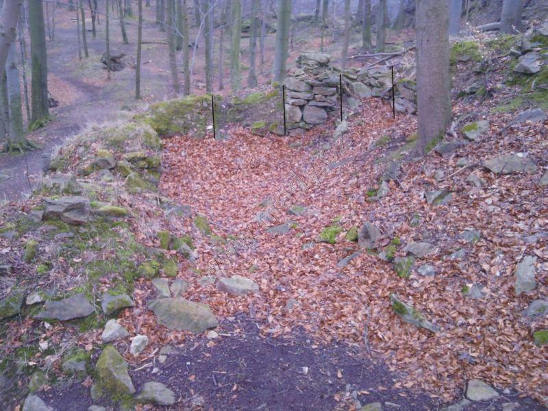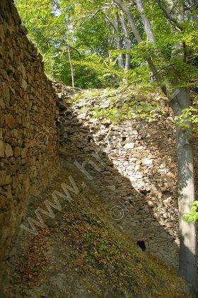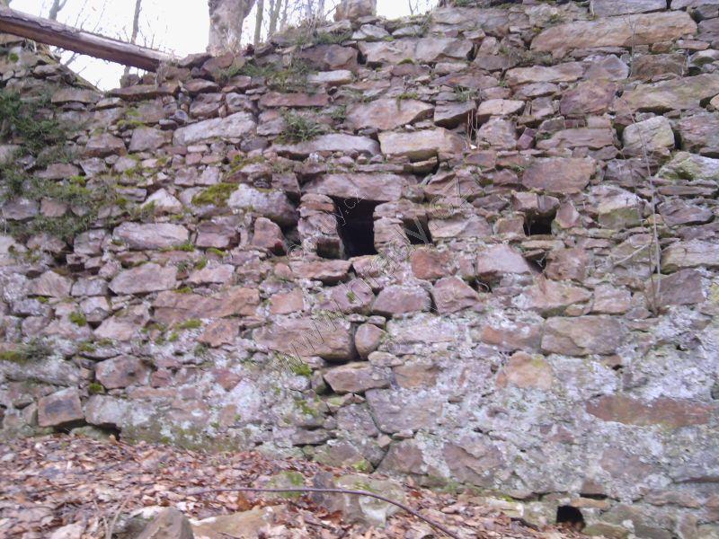 Otvor neznámé funkce (střílna?, odpad?) kousíček vlevo od pozůstatků omítky (obrázek výše), v literatuře jsem se o něm nedočetl