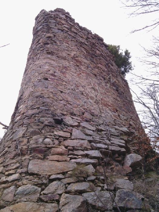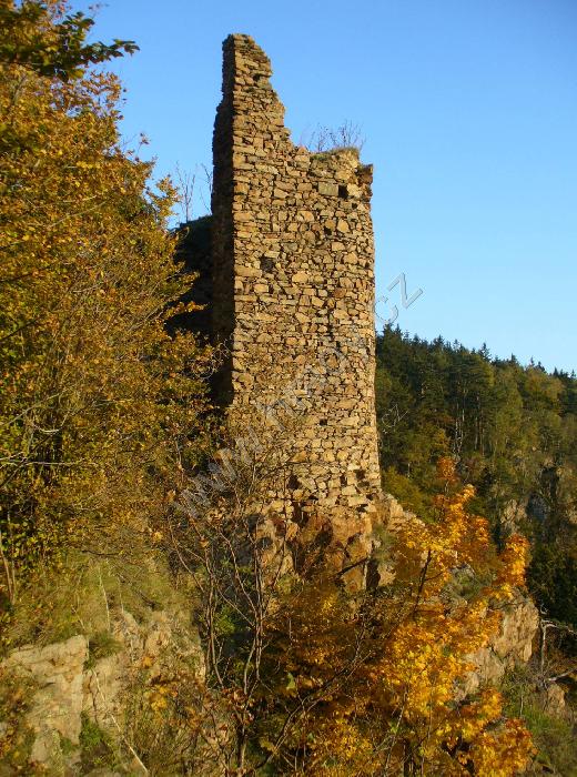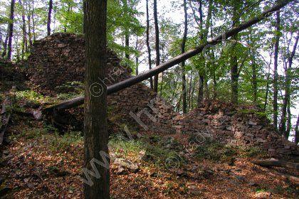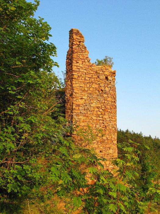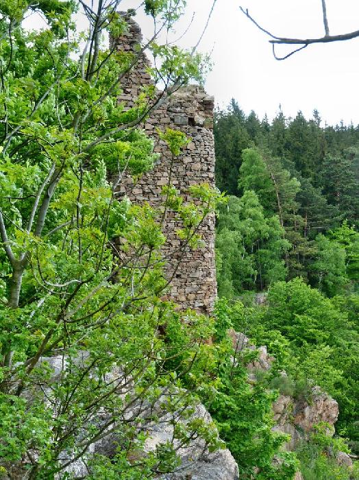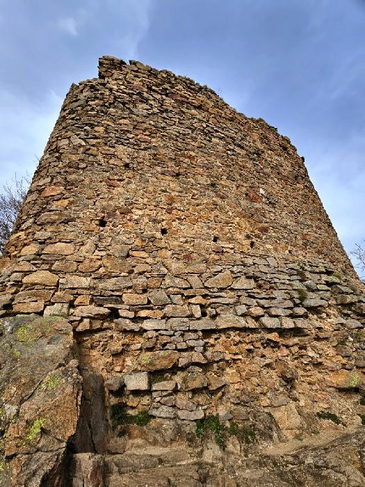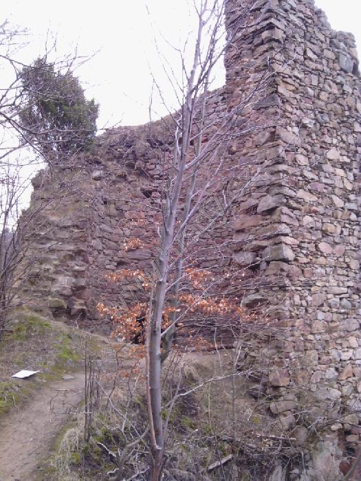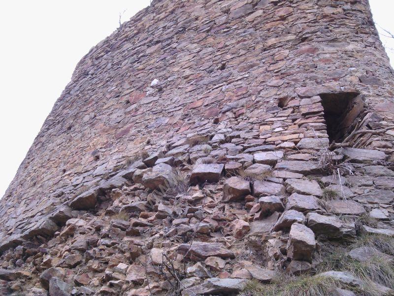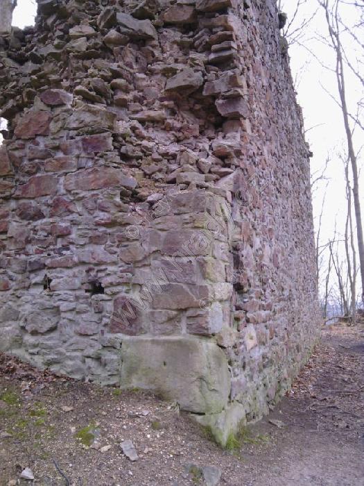 Východní nároží branské věže, dole jsou patrny velké kvádry armovaného nároží, výše je nároží novodobě vyzděno, ještě výše je úplně zřícené